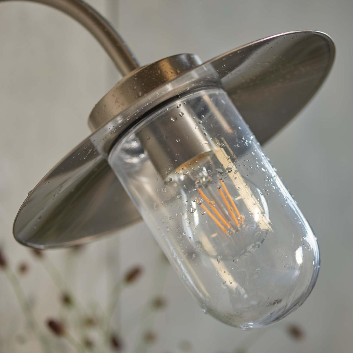 Featuring the Vogue Ballard, a classic exterior wall light, with a nod to nautical fisherman's lanterns, finished in brushed stainless steel with clear glass shade. This light is IP44 rated for safe outdoor use, with adjustable PIR sensor to detect heat and automatically activate the light. The PIR can be altered to suite various detection angles and illumination times, perfect for use with LED filament lamps.