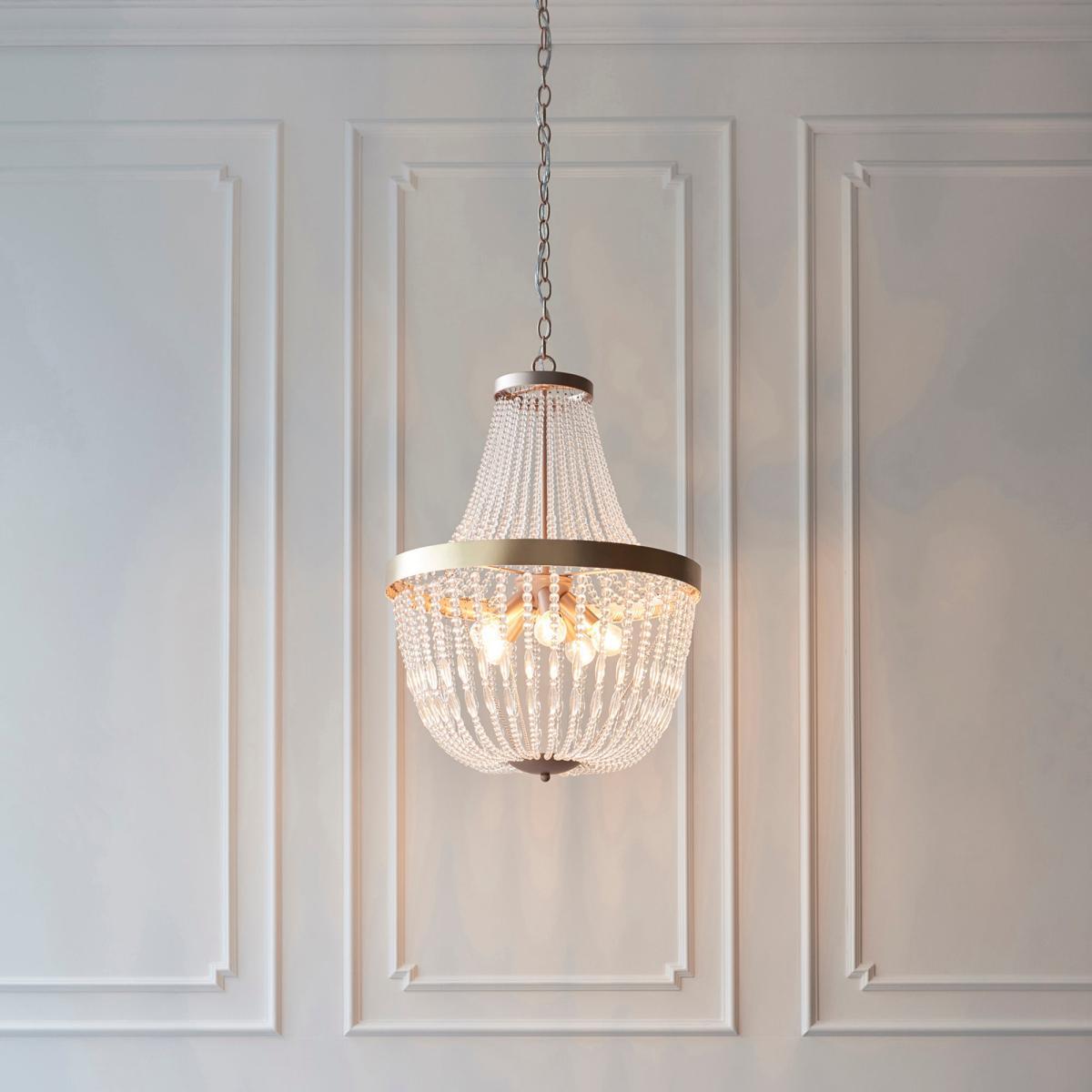 In a modern-style chandelier style, this gold celling light fitting is perfect for adding that elegant wow factor to any room. With a rose gold finish and clear glass beads this fitting is classic and contemporary. This light has an adjustable drop and is dimmable. This light is compatible with LED lamps.