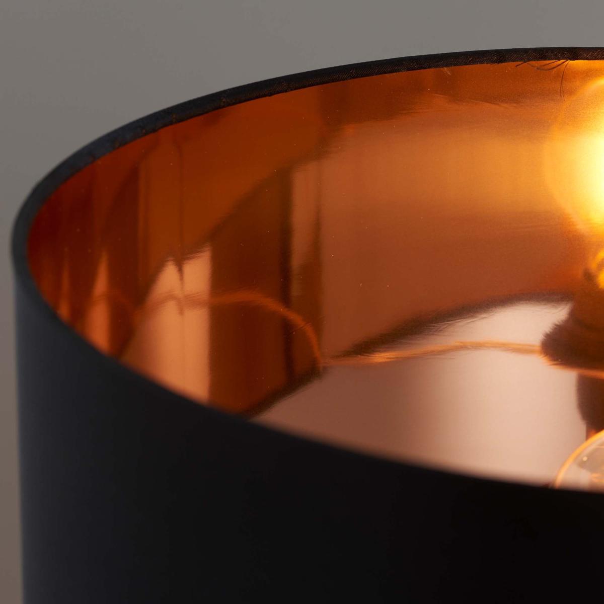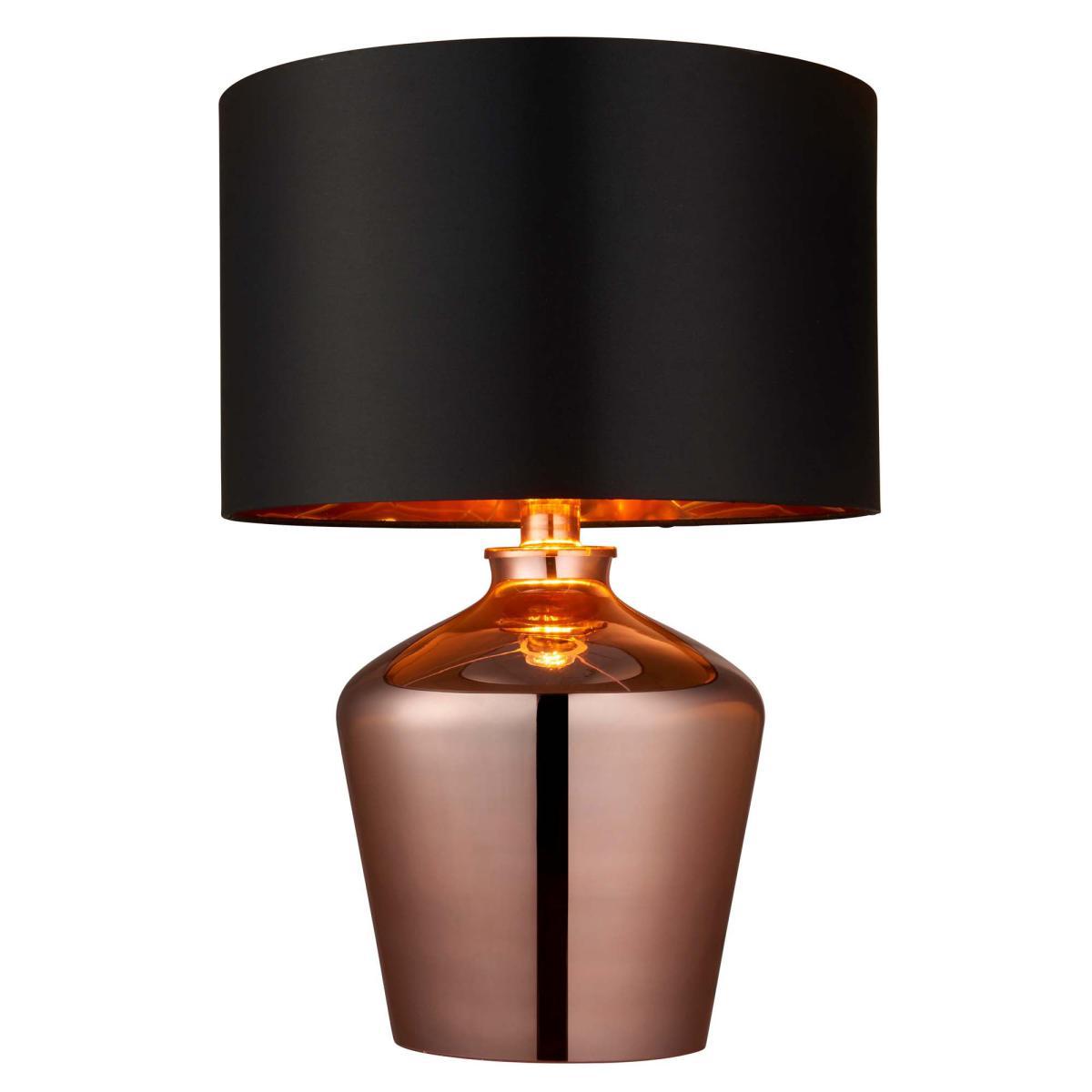 Perfect for bringing a sleek and glamorous touch to any space, the Vogue Courtland table lamp features a high shine, copper effect base, paired with a beautiful black faux silk shade with a reflective copper inner. This piece is fitted with an inline switch and suitable for use with LED lamps.