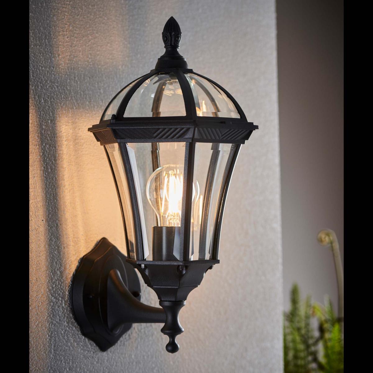 Light up the exterior walls of your house with this traditional lantern style wall light. Safe for outdoor use with a IP44 rating, this dimmable light with a clear glass shade is made from die cast aluminium in a painted matt black textured finish and has a classic yet durable style.