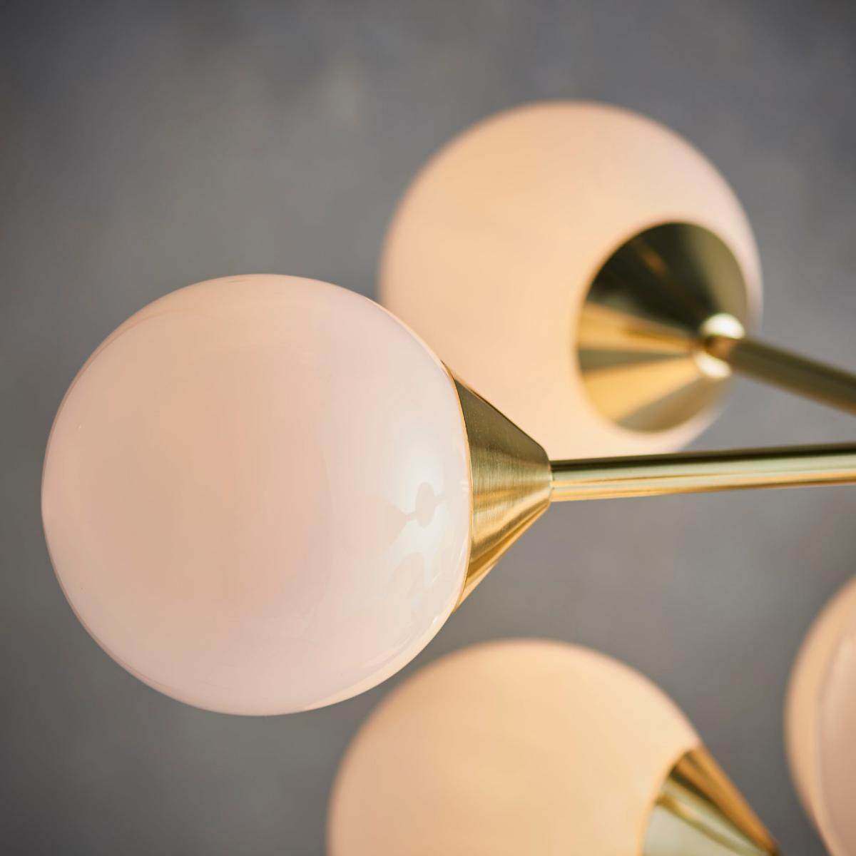 A timeless and modern design with a 'mid-century' feel, the impressive Elberton Chandelier is at home in both modern and classic interiors. This light fitting is finished in an 'on-trend' brushed brass finish, paired with gloss white glass shades and suspended from height adjustable thin wire cable with clear flex.