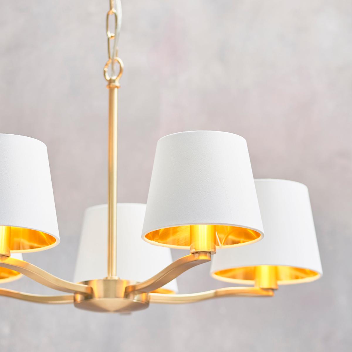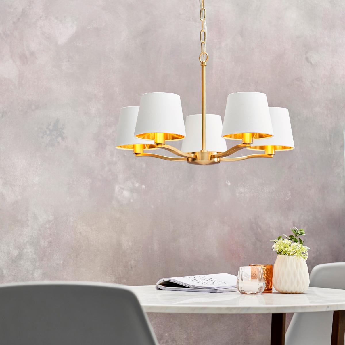 Update your home and add a touch of class with this luxury 5 light ceiling fitting, featuring vintage faux white silk shades each with a metallic inner and contrasting brushed satin gold effect plated finish. Available in two colourways for you to choose from, so you can pick one colour that suits your home the best!