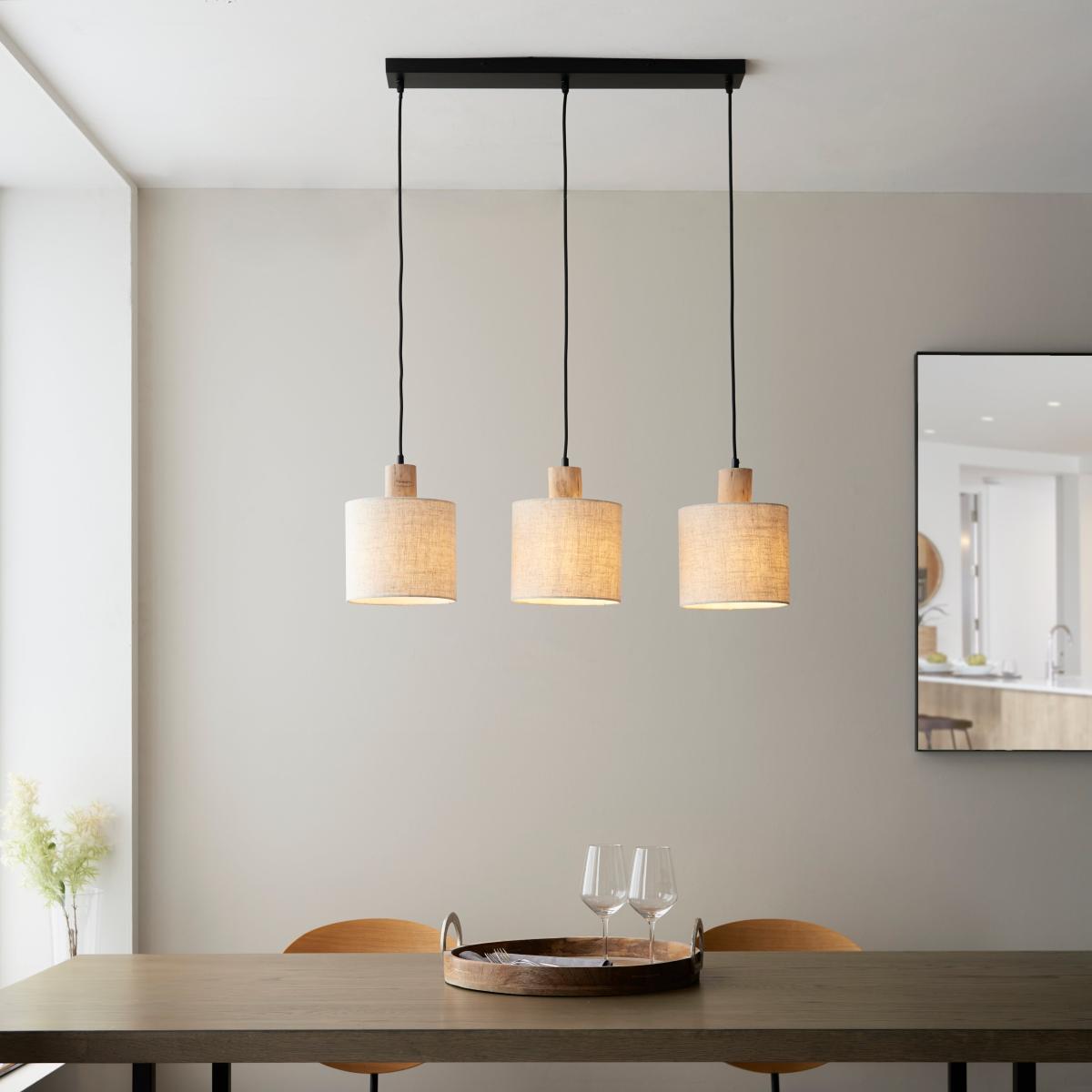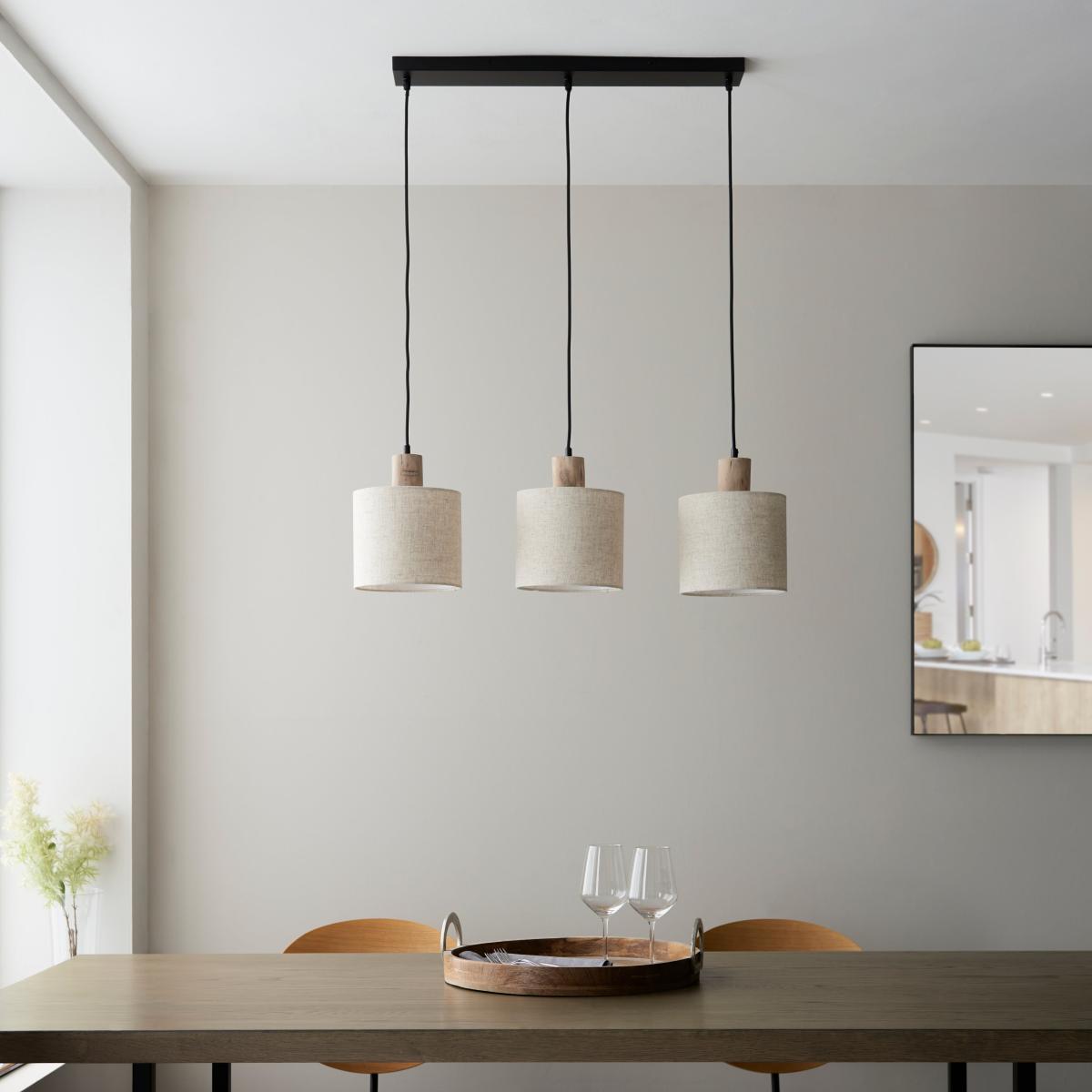 Illuminate your dining space with the organic charm of Ferris 3 light diner ceiling fitting, a uniquely designed lighting solution that celebrates the beauty of nature. Crafted from Eucalyptus wood, the pendant features natural linen shades suspended from black flex, creating a visually striking and harmonious composition. Each element is crafted by nature to be imperfectly perfect, adding character and warmth to your space. Compatible with a dimmer switch, this pendant provides flexibility in setting the perfect ambience for your dining area.