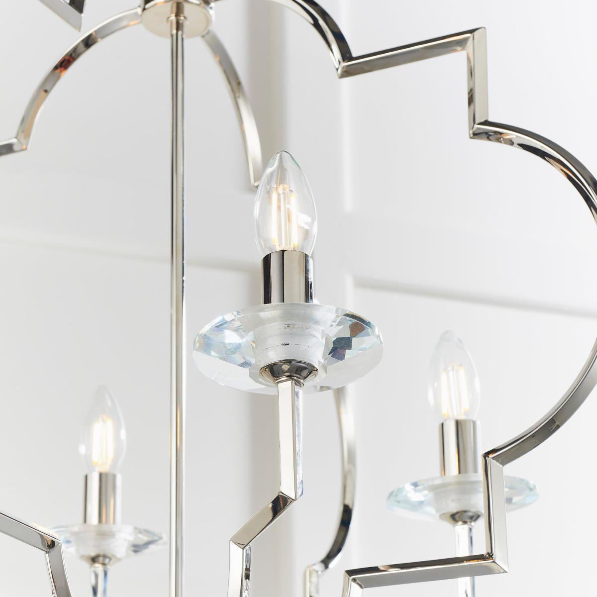 Boasting a stylish polished nickel and clear crystal glass finish, this ceiling fitting is elegant and stylish, adding the factor to any room. With high quality K5 crystal bobeches, this dimmable light is ideal for any room. This light has an adjustable height and is compatible with LED lamps.