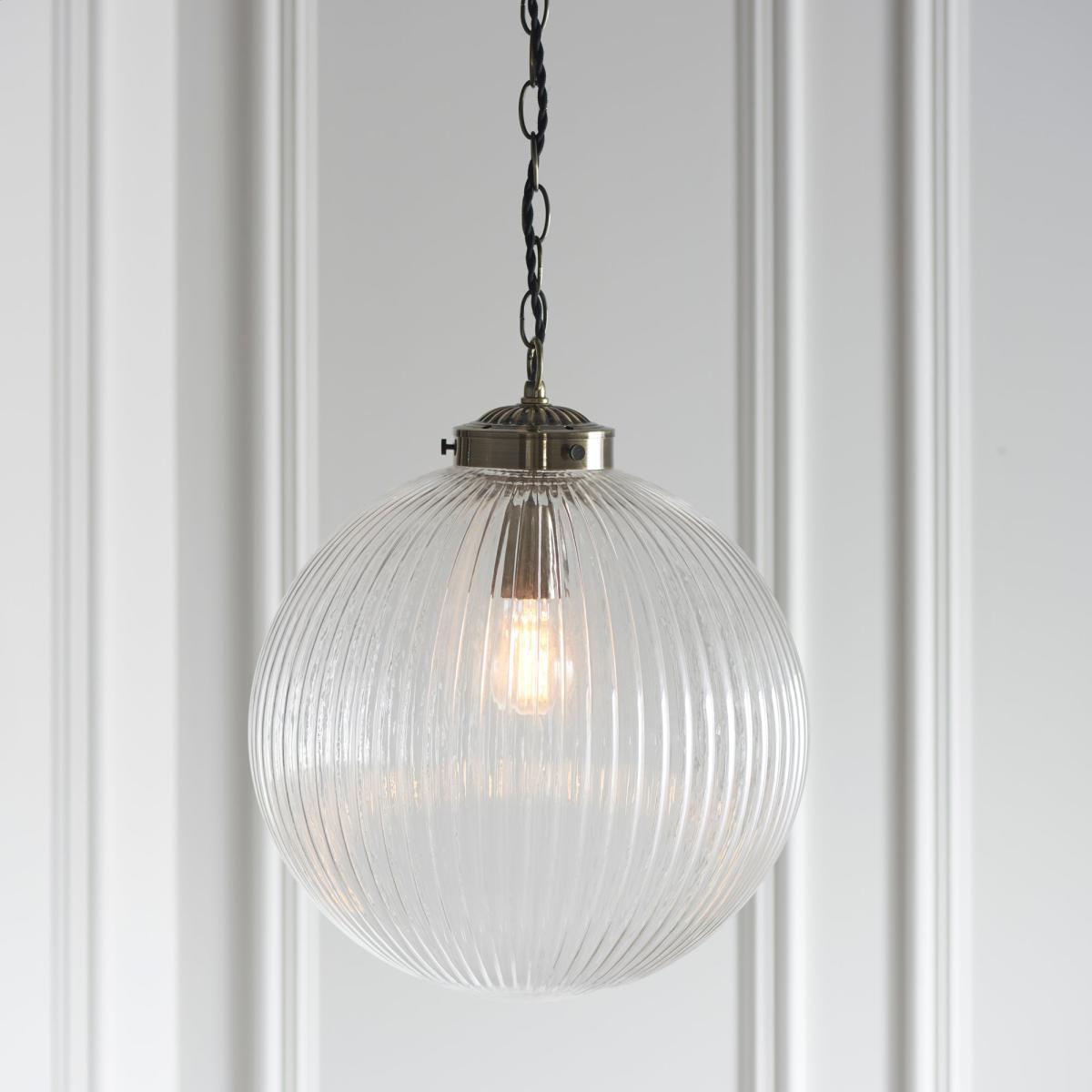 The College ceiling pendant fitting features a ribbed, spherical glass shade hanging from a decorative chain finished in antique brass, offering a modern take on a traditional look. Ideal for a range of settings, this light fitting is height adjustable and is compatible with dimmer switches.