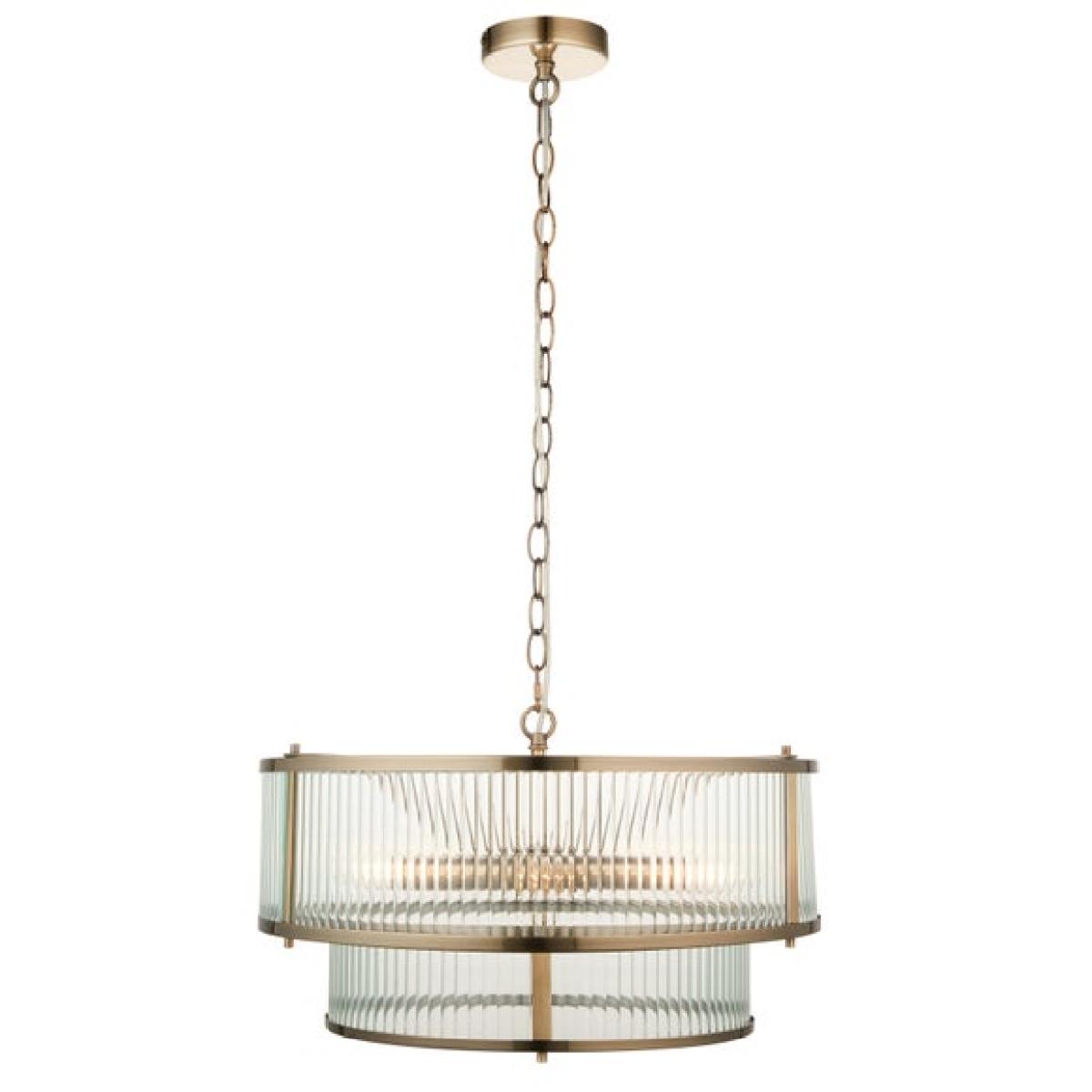 * Modern/Classic Look & Design * Antique-Brass Plated Metalwork * Beautiful Ribbed Glass Panel Shade * Height Adjustable - Tailored Ambience * Dimmable Compatible - Requires Dimmable Bulb & Switch * Pair with E14 LED Filament Lamps Infuse your home with grandeur with the Vogue Hadley Modern 5 Light Adjustable Chandelier. Boasting antique-brass plated metalwork, this piece also features an eye-catching ribbed glass panel shade and height adjustable capabilities - allowing for customisable ambience.