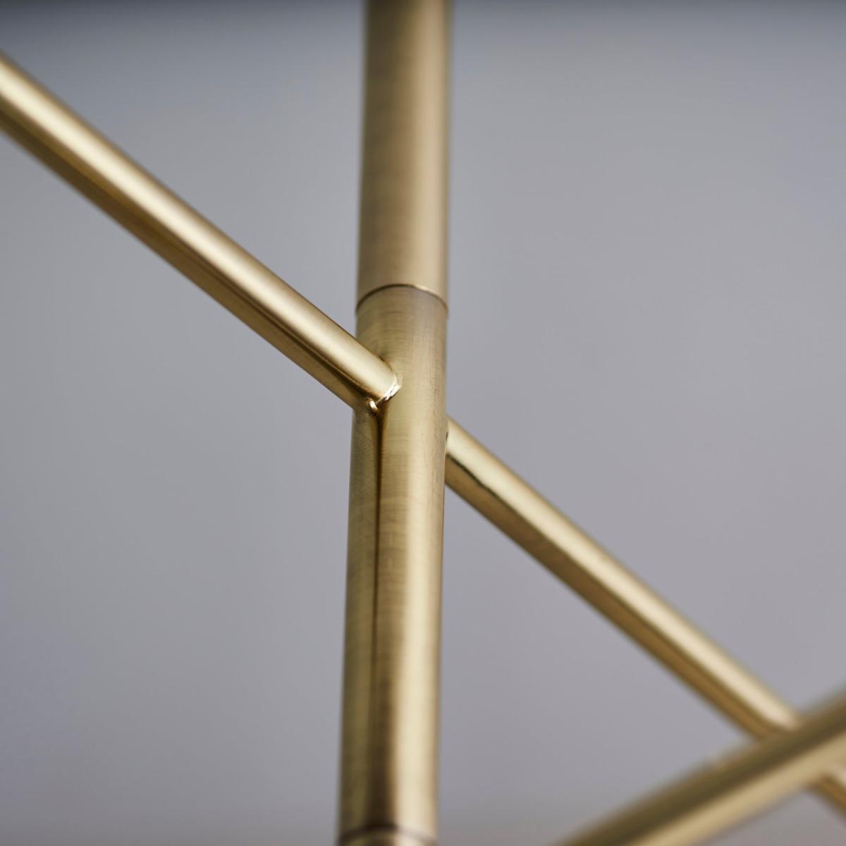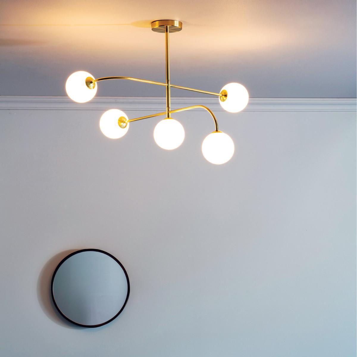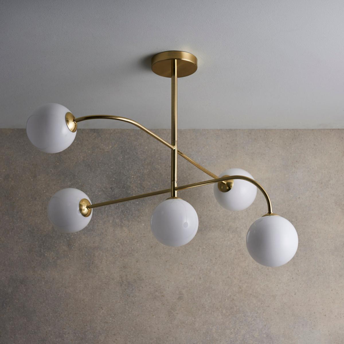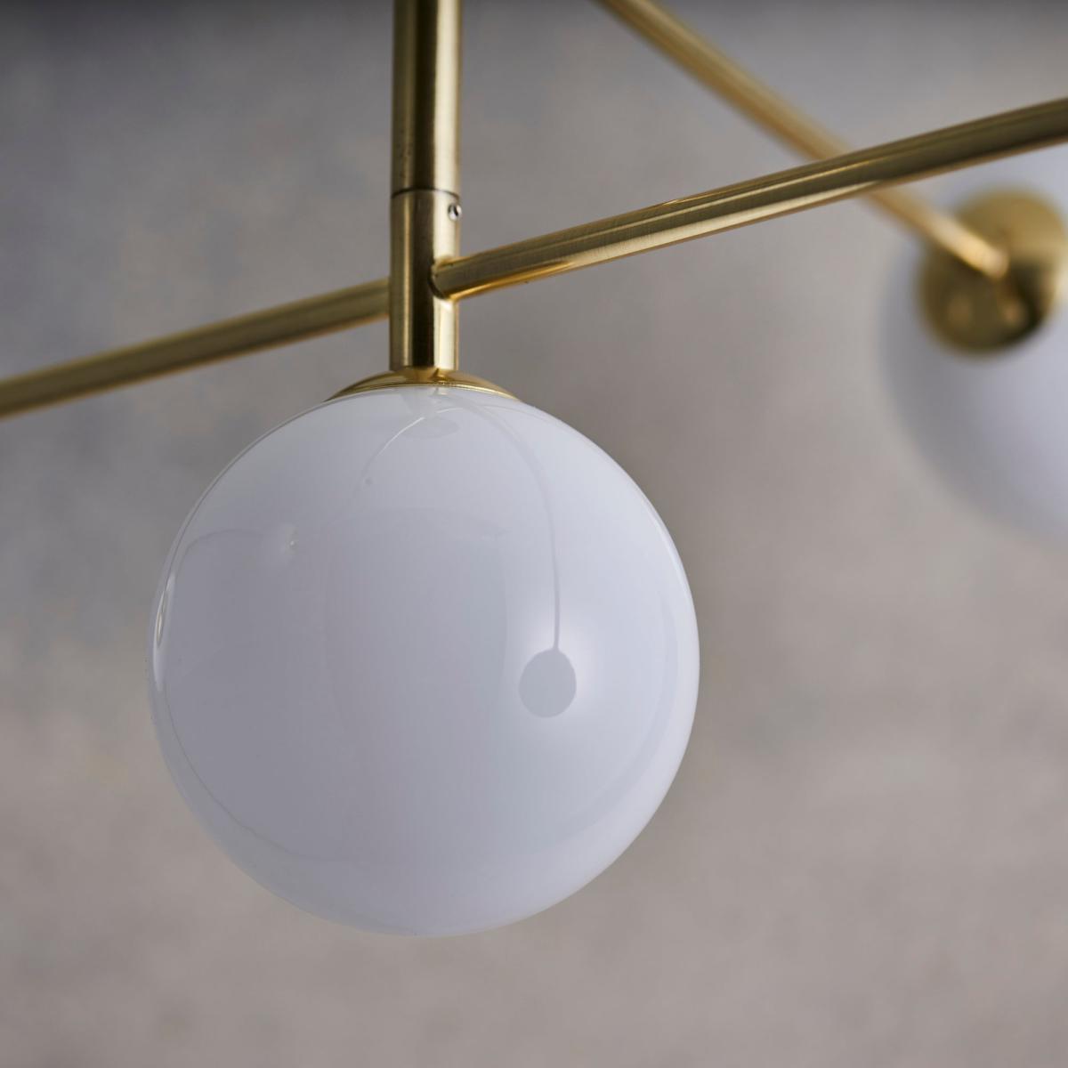 Create an 'on-trend' mid century feel with the Hartwell Flush Chandelier, a perfect combination of gloss opal blown glass shades with brushed brass metalwork. This ceiling light explores the art of balance with a mix of soft curves blended with a linear structure.