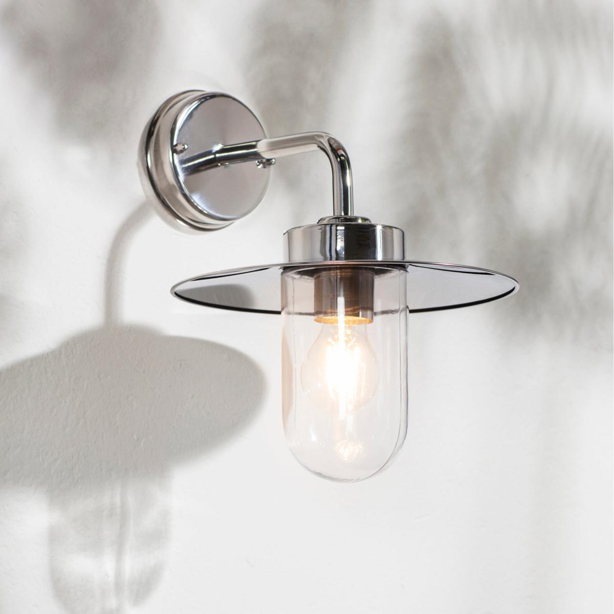 A modern take on a classic exterior wall light, with a nod to nautical fisherman's lanterns, the Hope outdoor wall Light is beautifully finished in polished stainless steel with clear glass shade. Pair with filament LED lamps to create a timeless authentic look.