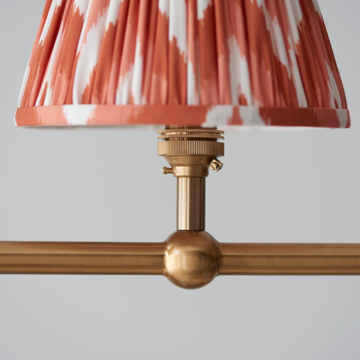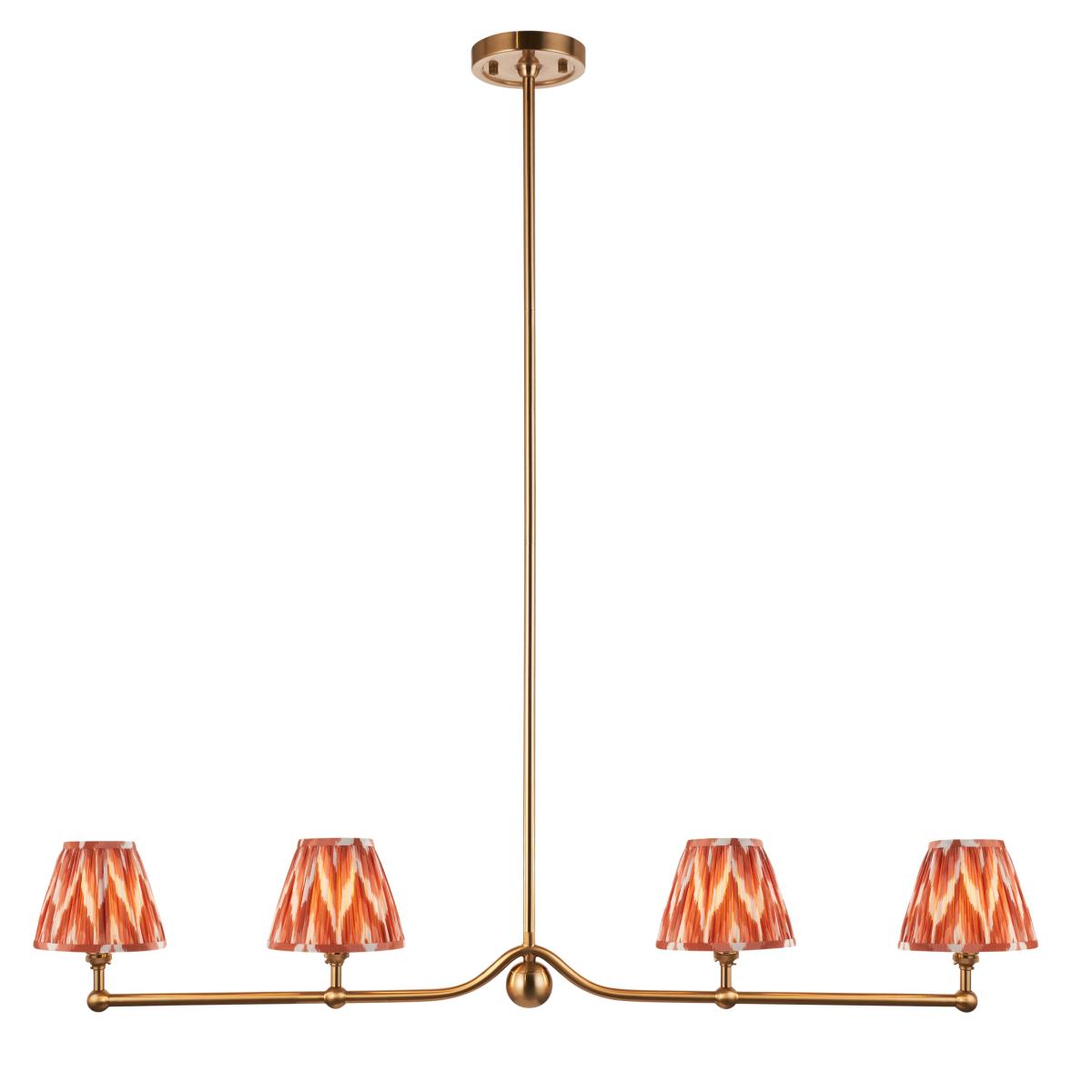 * Eye-Catching Orange Zigzag Design * Handmade, Pleated Tapered Shades * Multi-Stem Height Options - Tailored Ambience * Authentic Brass B22 Lamp Holders * Dimmable Compatible - Requires Dimmable Bulb & Switch * Compatible with B22 LED Lamps Bring warm, tailored style to your space with the Vogue Javier 4 Light Adjustable Diner Light, complete with orange zigzag lamp shades. Finished in brushed aged brass, it features handmade gathered pleated tapered shades in digitally-printed, apricot-orange faux silk — complete with taped edges and a smooth plain inner lining for a refined look. The multi-stem design allows for adjustable height, making it a perfect fit over dining tables or kitchen islands. With authentic brass B22 lamp holders, it’s compatible with B22 LED lamps - giving you flexibility in one elegant piece.