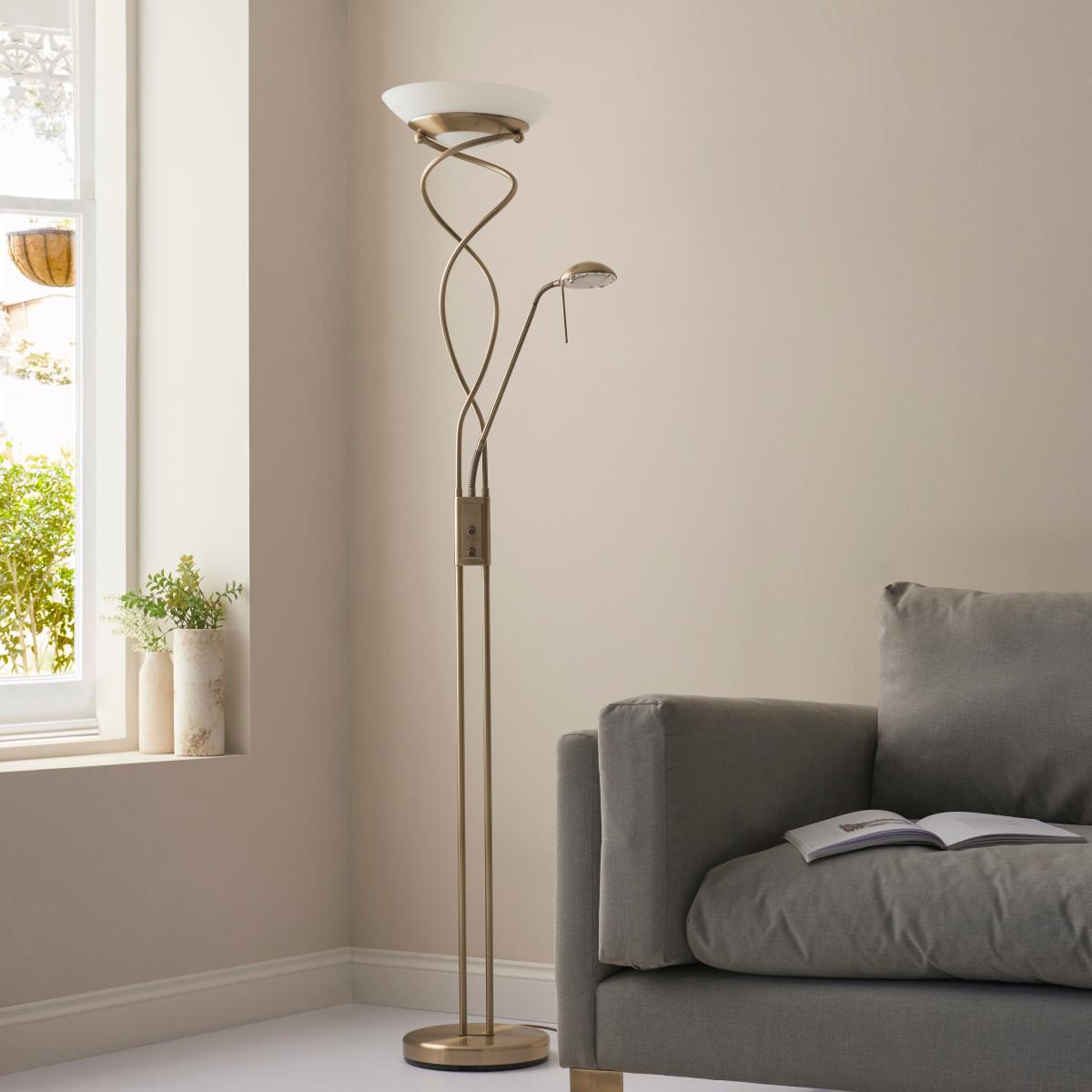 Convenient for your use, this floor lamp features a classic swirl design with a frosted glass uplighter with a fully directional flexible reading light arm and dual rotational dimmer switches to adjust the brightness to your desired level. Simply choose the light you wish to have on. This floor lamp is available in two colourways for you to choose from.