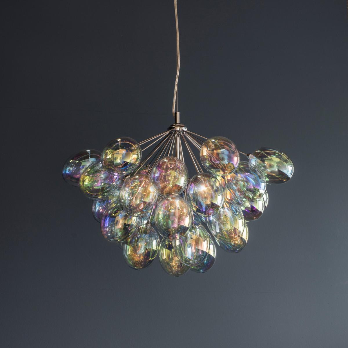 A stunning addition to modern interiors, the chrome plated Infinity ceiling pendant creates amazing light patterns through multiple iridescent glass shades. Suspended from height adjustable wire cable and clear flex.