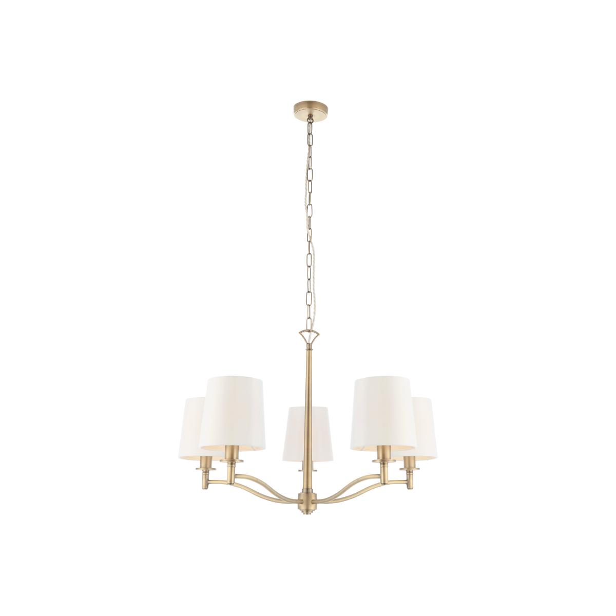 * Simple, Stylish Design * Vintage White Fabric Shades * Height Adjustable - Tailored Ambience * Dimmable Compatible - Requires Dimmable Bulb & Switch * Pairs Perfectly with E14 LED Lamps Add a simple, yet stylish, touch to your living space with the Vogue Oriana 5 Light Adjustable Pendant Light. With matt antique-brass metalwork; vintage white fabric shades; and height adjustable capabilities, it's your home's newest must-have.