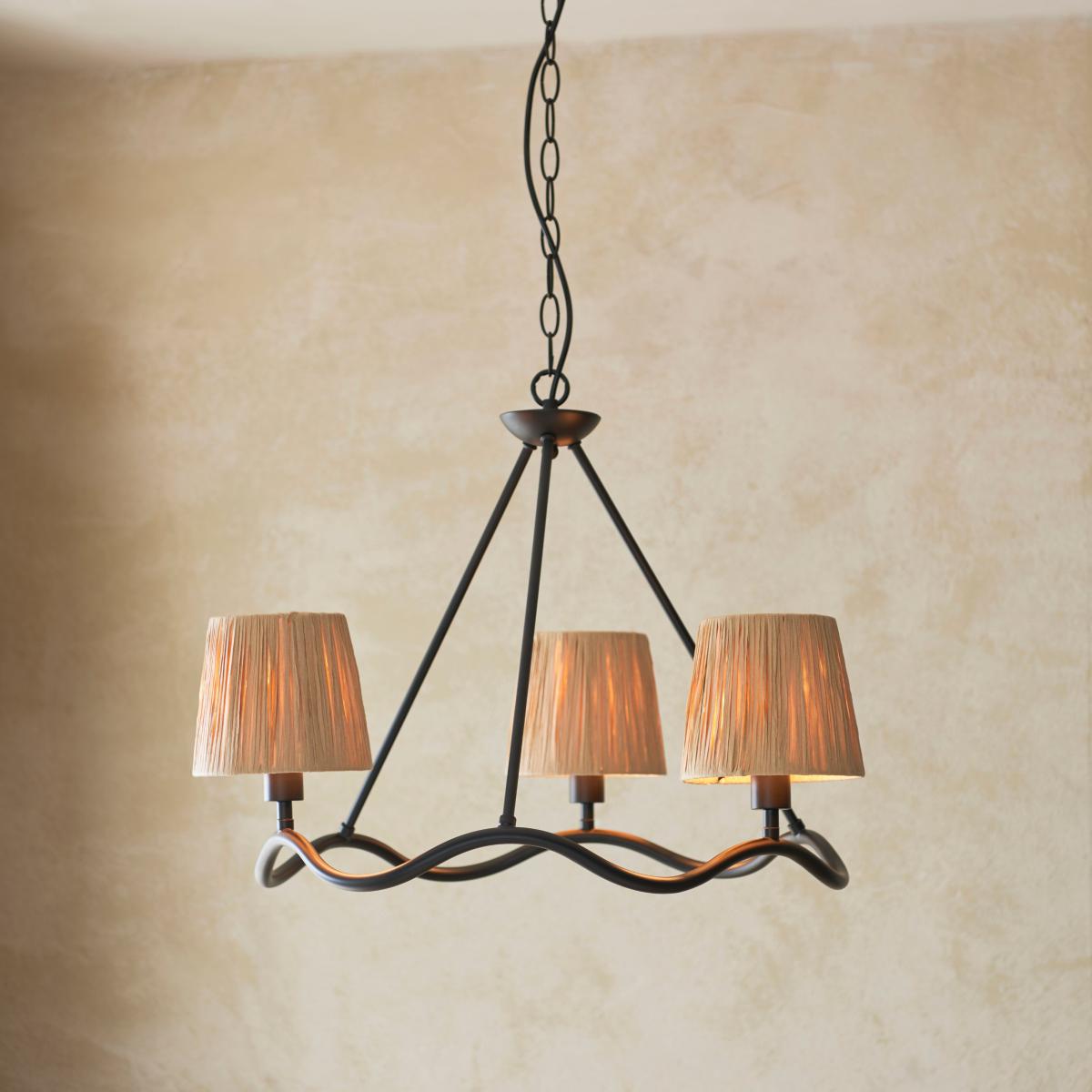 * Boho-Inspired Look & Design * Matt Black Painted Finish * Hand-Wrapped Raffia Tapered Shades * Height Adjustable - Tailored Ambience * Dimmable Compatible - Requires Dimmable Bulb & Switch * Compatible with E14 LED Lamps Bring boho vibes to your home with Vogue Lighting's Priya Boho 3 Light Adjustable Pendant Light, which features a unique wave-shaped hoop. It boasts a matt black painted finish; hand-wrapped raffia tapered shades; and a height adjustable chain, allowing for customised ambience.