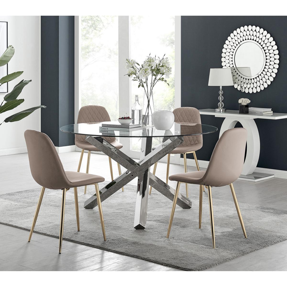 Beautifully crafted and designed, the Vogue table will surely make a modern statement in any dining space. The strong chrome legs provide plenty of support for the table as well as adding a contemporary feel and striking design, whilst the glass top is made from 10mm strong clear tempered glass. The large 136cm x 136cm glass top offers plenty of space for up to 6 guests, ideal for entertaining! With such an appealing design and price tag we just love it and are sure that you will too! Paired alongside our beautiful faux leather Coronachairs, you can't go wrong with this set. With a perfect balance of pattern and texture the new Corona Chair is a statement piece ready for the modern dining space. The trendy gold or silver chrome legs are all the rage and offer a perfect way to add an accent of lustre to your home. The Scandi-style faux leather seat with diamond pattern stitching is a unique take on a classic design offering comfort and durability for everyday use.
