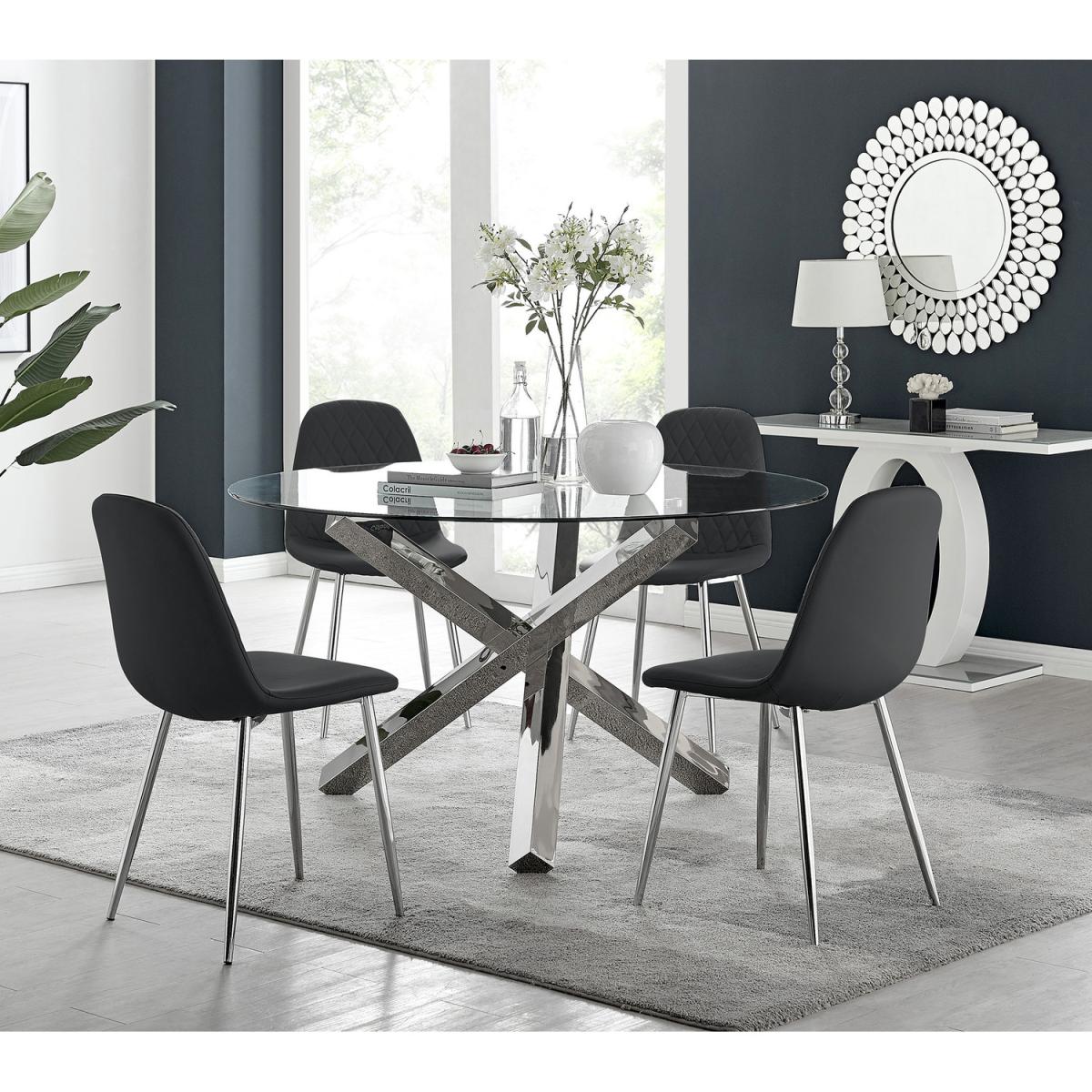 Beautifully crafted and designed, the Vogue table will surely make a modern statement in any dining space. The strong chrome legs provide plenty of support for the table as well as adding a contemporary feel and striking design, whilst the glass top is made from 10mm strong clear tempered glass. The large 136cm x 136cm glass top offers plenty of space for up to 6 guests, ideal for entertaining! With such an appealing design and price tag we just love it and are sure that you will too! Paired alongside our beautiful faux leather Coronachairs, you can't go wrong with this set. With a perfect balance of pattern and texture the new Corona Chair is a statement piece ready for the modern dining space. The trendy gold or silver chrome legs are all the rage and offer a perfect way to add an accent of lustre to your home. The Scandi-style faux leather seat with diamond pattern stitching is a unique take on a classic design offering comfort and durability for everyday use.