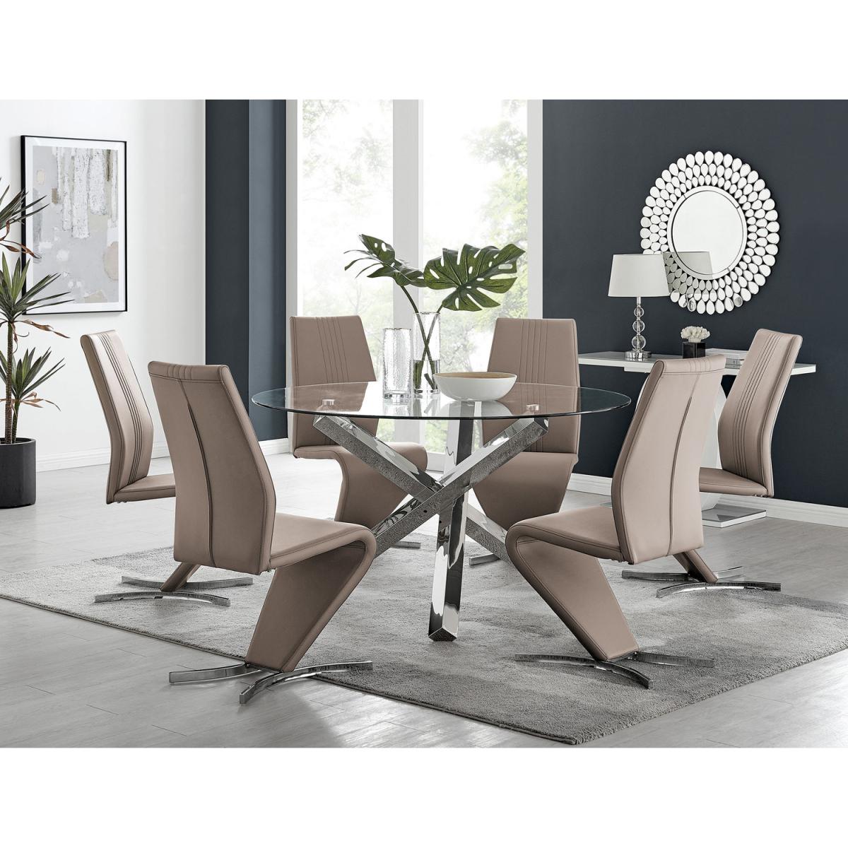 Beautifully crafted and designed, the Vogue table will surely make a modern statement in any dining space. The strong chrome legs provide plenty of support for the table as well as adding a contemporary feel and striking design, whilst the glass top is made from 10mm strong clear tempered glass. The large 136cm x 136cm glass top offers plenty of space for up to 6 guests, ideal for entertaining! With such an appealing design and price tag we just love it and are sure that you will too! Partnered alongside our premium modern Willow dining chairs, this dining set will really offer the wow factor! These eye-catching, faux leather chairs are fully padded throughout and have an ergonomically designed back support to maximise comfort. They also feature half-moon chromed feet, which give these chairs a sturdy base. The curved design gives the Willow chair a contemporary elegance and they compliment the table perfectly. Add your own personality by choosing from a range of colours for the chairs