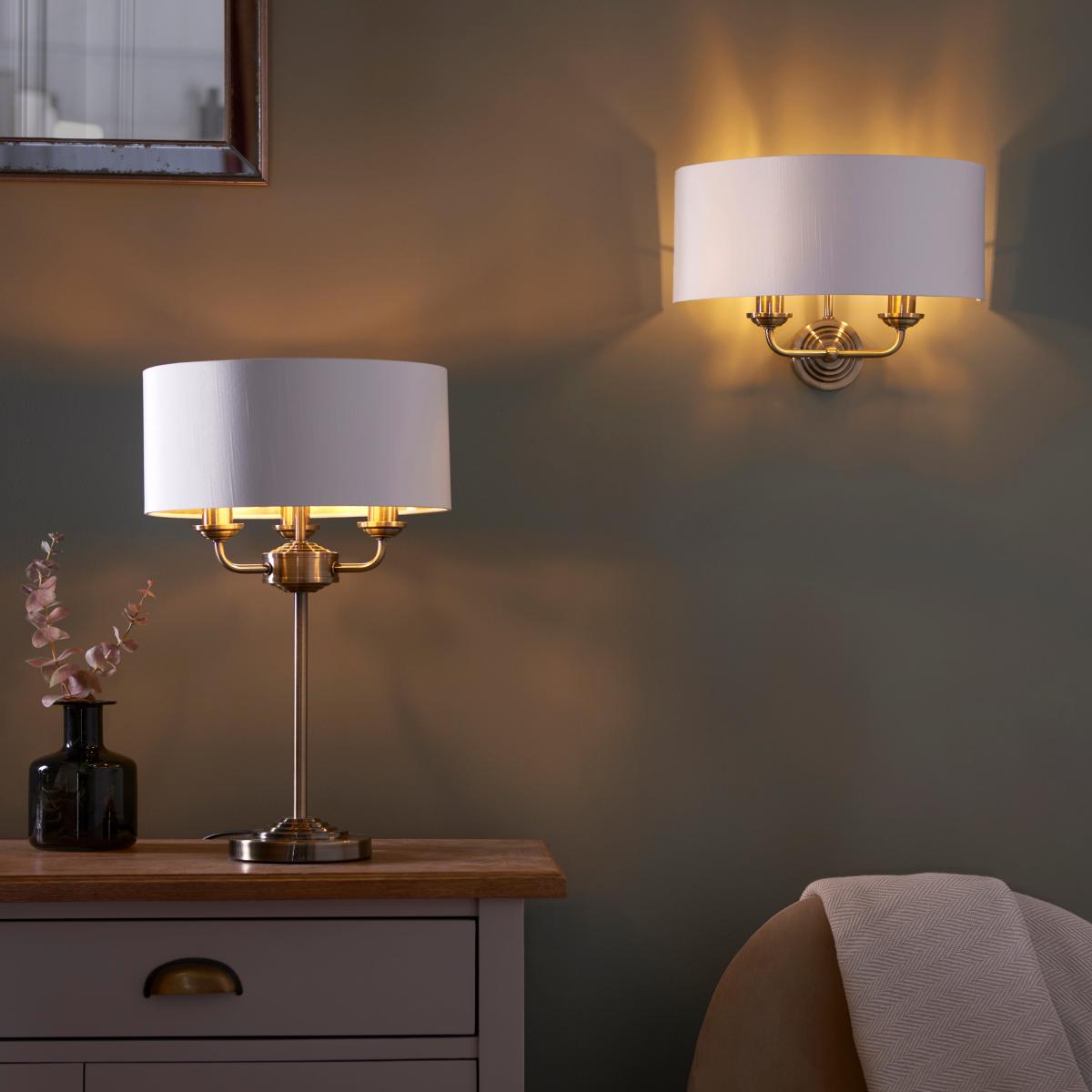 * Elegant, Traditional Design* Antique Brass Metalwork* Features In-Line Switch* Requires: SES E14 Cap Type & Standard (GLS) Bulbs Add sophistication to your space with the Vogue Lighting Sandringham 3 Light Table Lamp. Its vintage-white fabric shade, lined with a gold metallic inner, pairs elegantly with antique brass metalwork. Featuring an in-line switch, this timeless lamp is the perfect addition to your home.