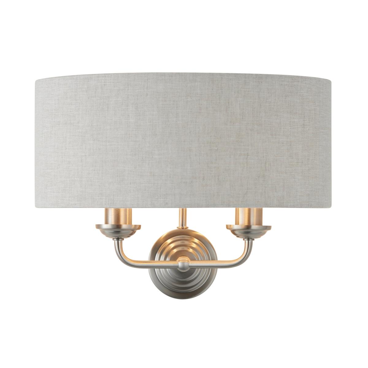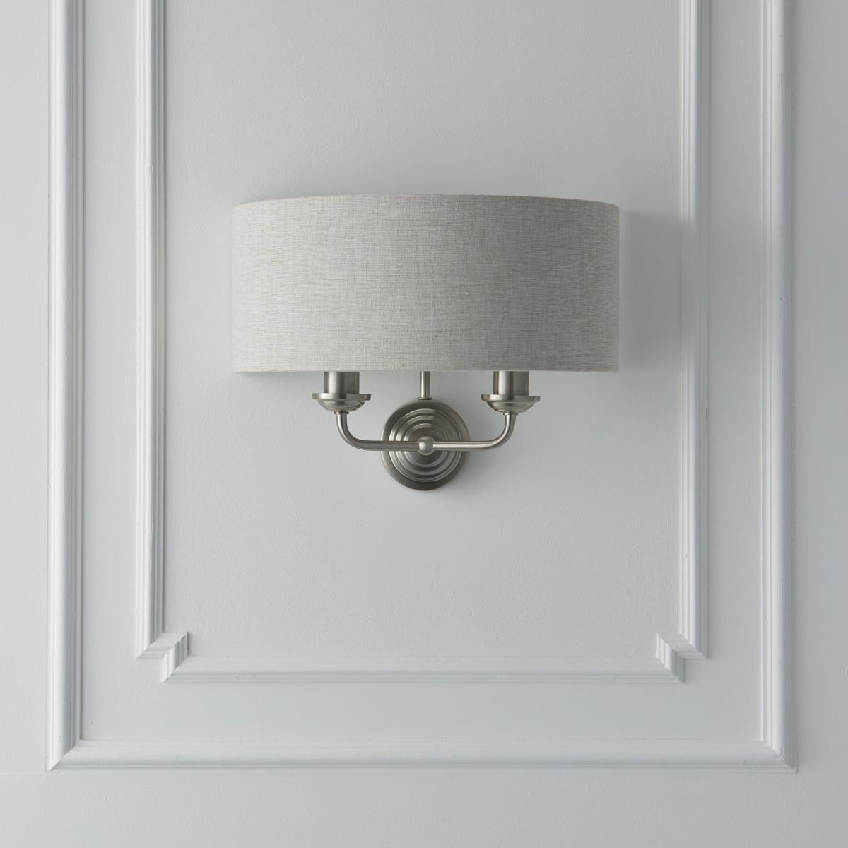 Impeccably crafted, the Sandringham wall light features brushed chrome finish metalwork that exudes refined charm. The natural linen shades, coupled with a matching metallic inner, bring warmth and a touch of classic beauty to your living space.
