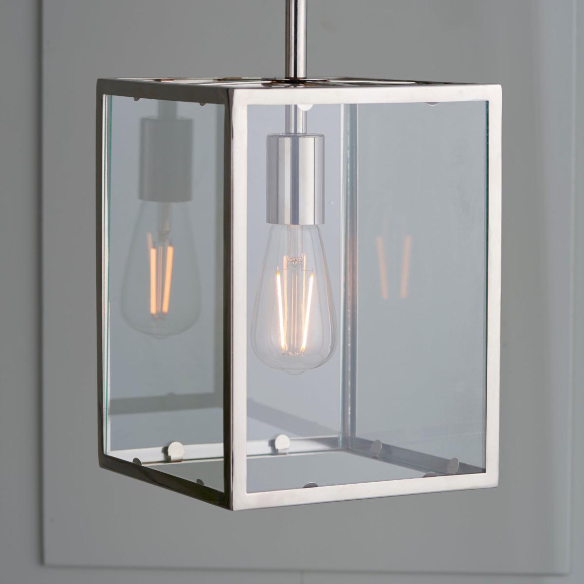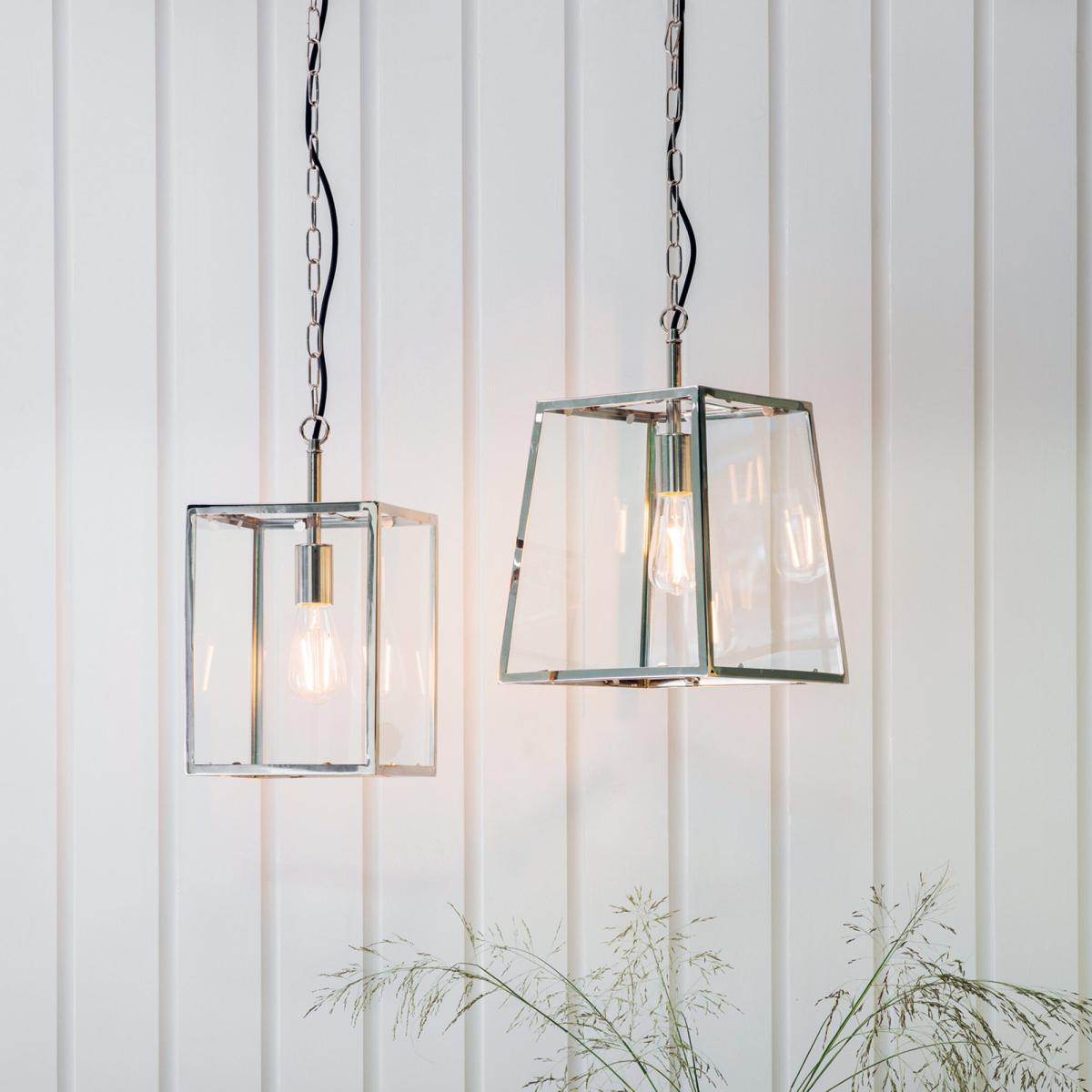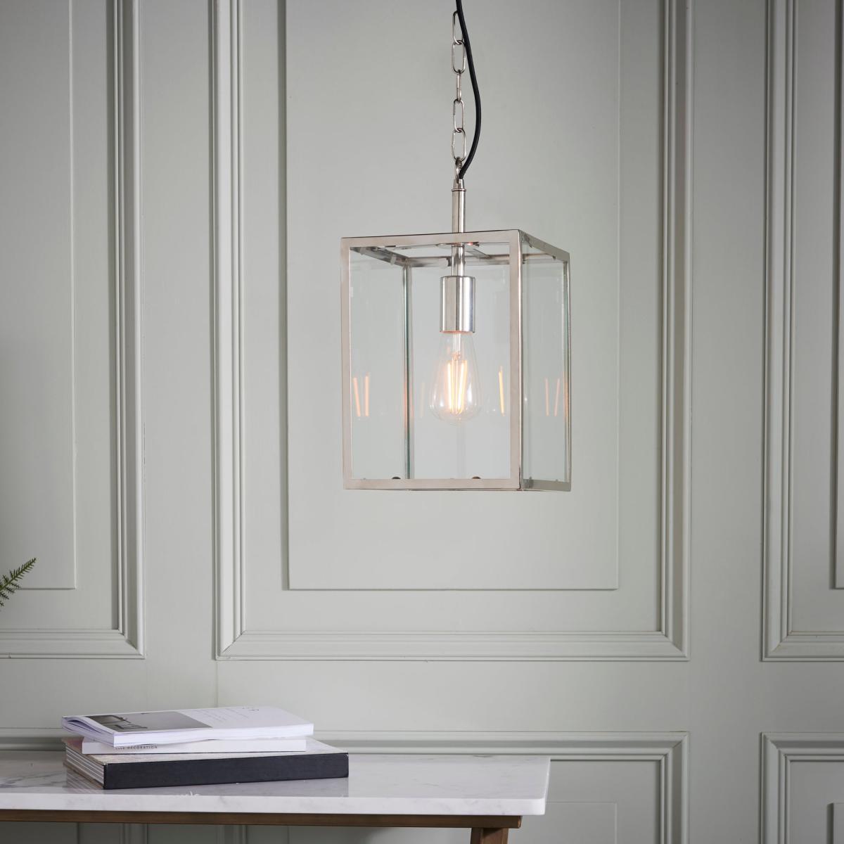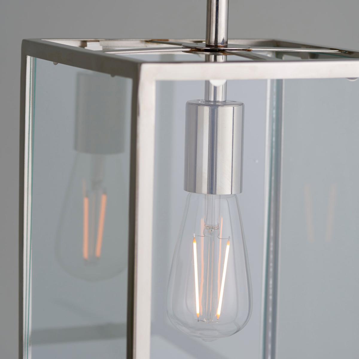 Inspired by box lanterns, the authentic and timeless Stockton Pendant fitting is the perfect compliment for today's relaxed classic interiors. This stunning fitting is finished in bright nickel and suspended from a fully height adjustable chain with black fabric flex. This piece is perfect for pairing with vintage style filament LED bulbs, perfectly framing them within the subtle metalwork frame and large clear glass panels.