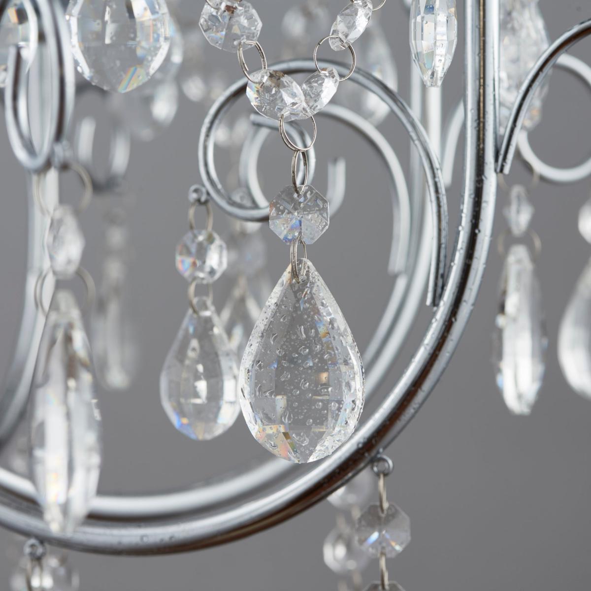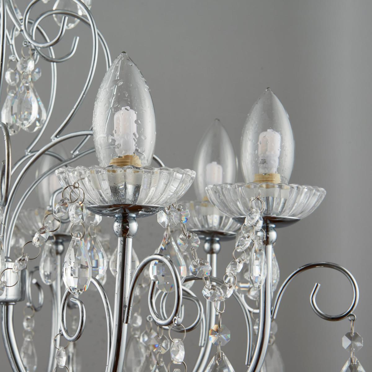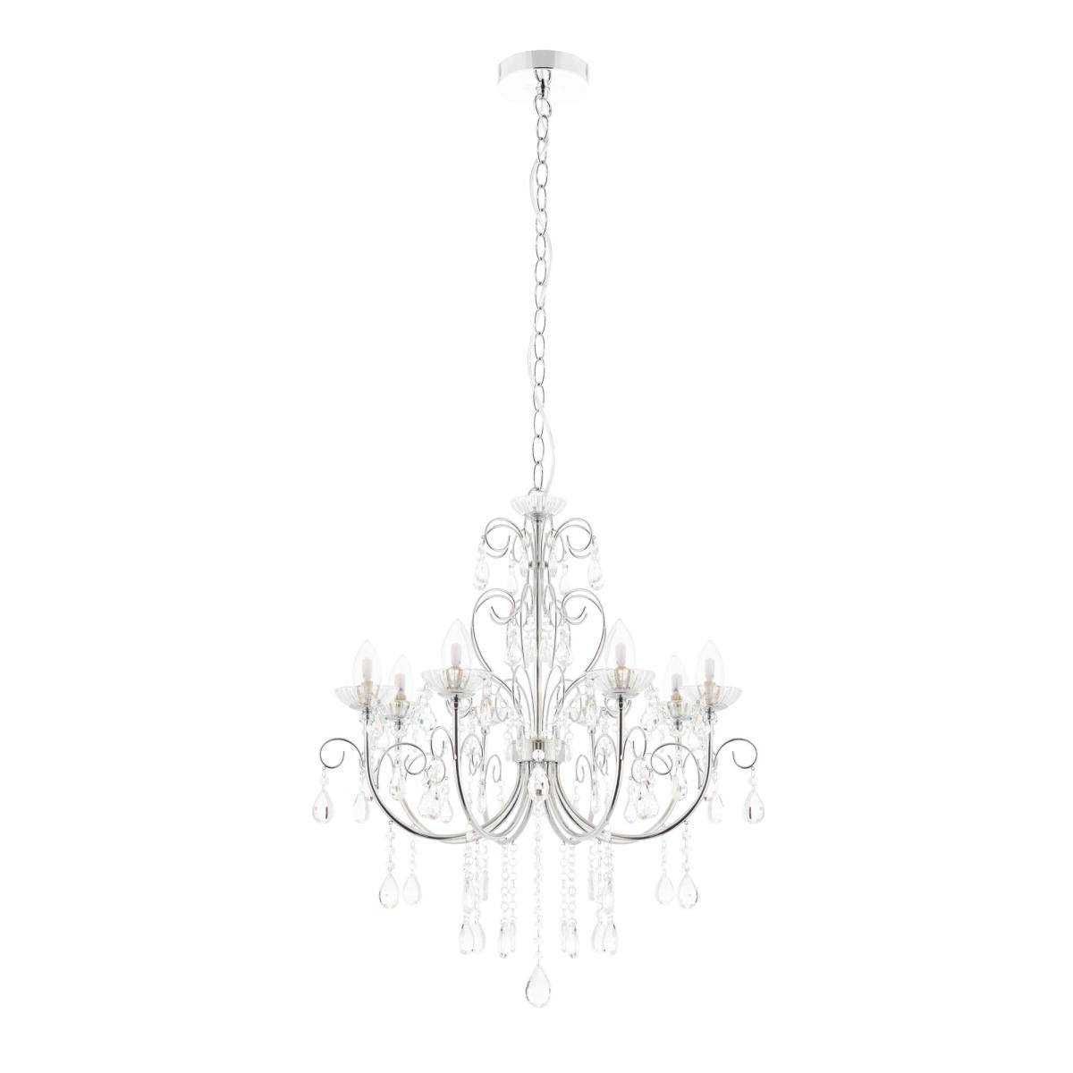 Complete with a stunning chrome finish and delicate crystal glass details and droplets, the Tabitha 8 light chandelier would bring a glamorous, traditional style to any space. Complete with a height adjustable chain suspension, this stunning light fitting is also IP44 rated so can even be installed in the bathroom to create a striking, opulent look.