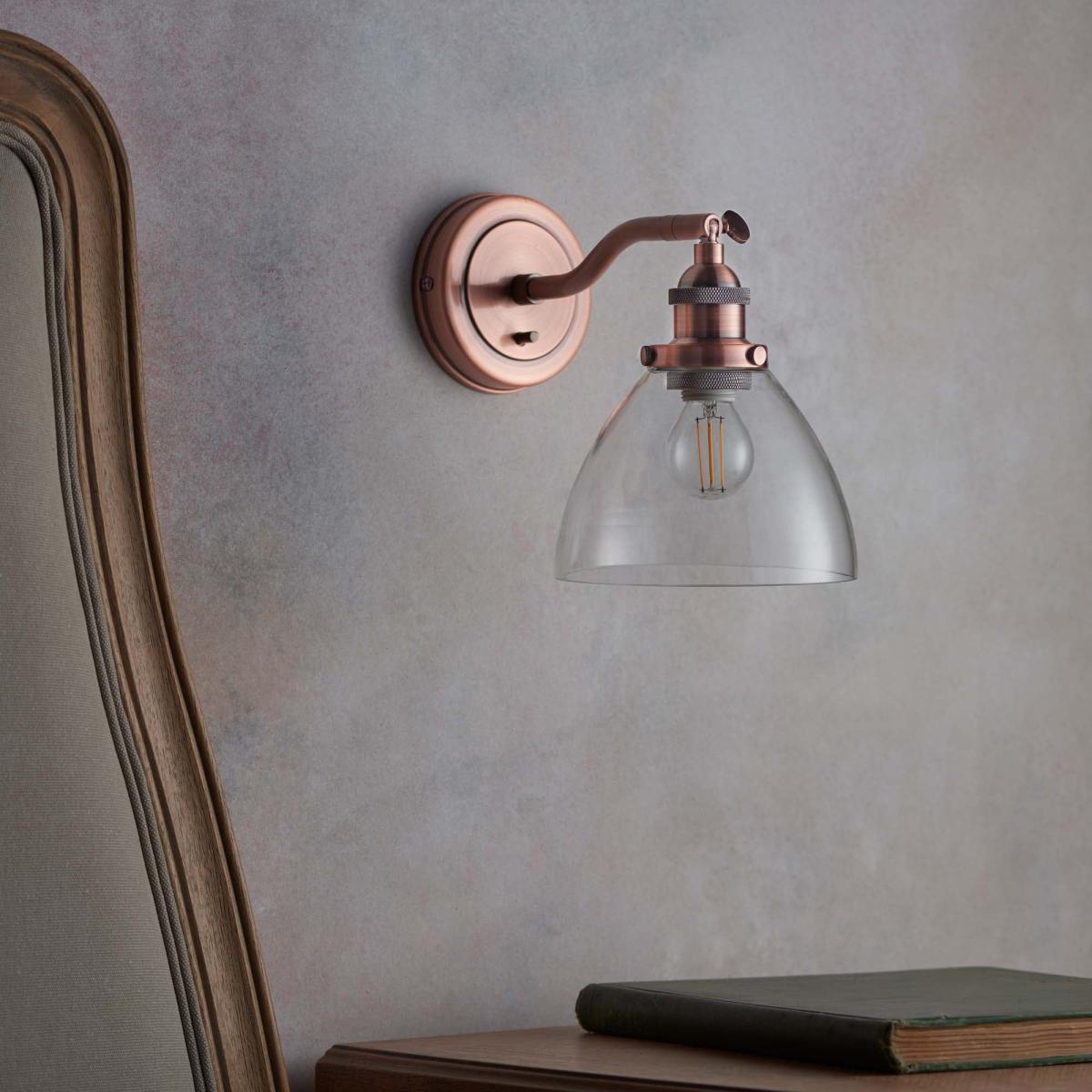 Introducing a modern retro style wall light, the Vogue Tobermory is beautifully finished in an aged copper plating, perfectly detailed with an authentic knurled lamp holder and a clear glass shade. This dimmable piece features an adjustable knuckle and accessible on/off switch, making this a practical and stylish wall light for your home. Pair this trendy piece with a Filament LED lamp for that perfect industrial style.