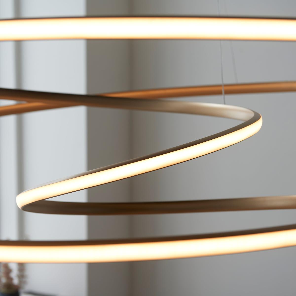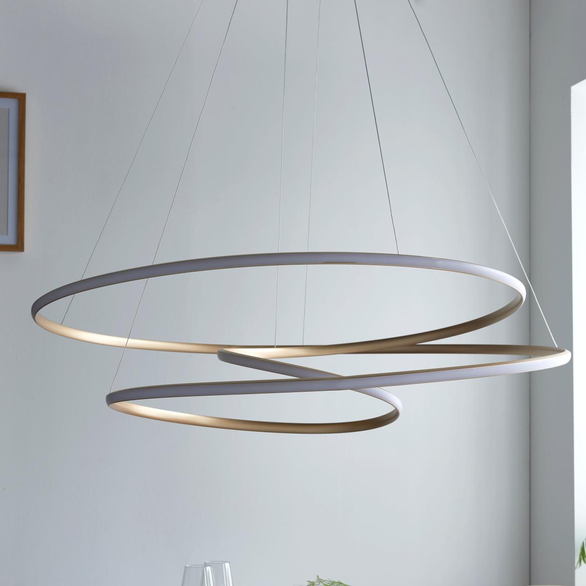 Add a touch of contemporary elegance to your space with our Tristan Large 1 light pendant, a lighting solution that effortlessly blends style and function. Featuring a captivating gold finish in a swirling design, this pendant light brings a modern and calming aesthetic to your interior. The integrated LED light ensures efficient illumination, while the dimmable feature, compatible with a dimmer switch, allows you to tailor the lighting to create the perfect ambience. Designed with versatility in mind, this pendant light is available in a small size and can be easily adjusted to different heights using delicate cables, creating a floating effect.