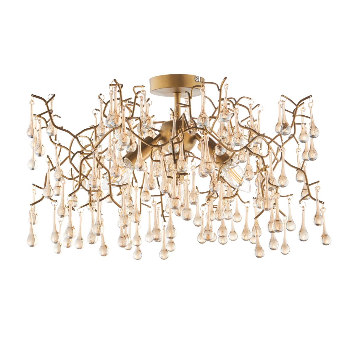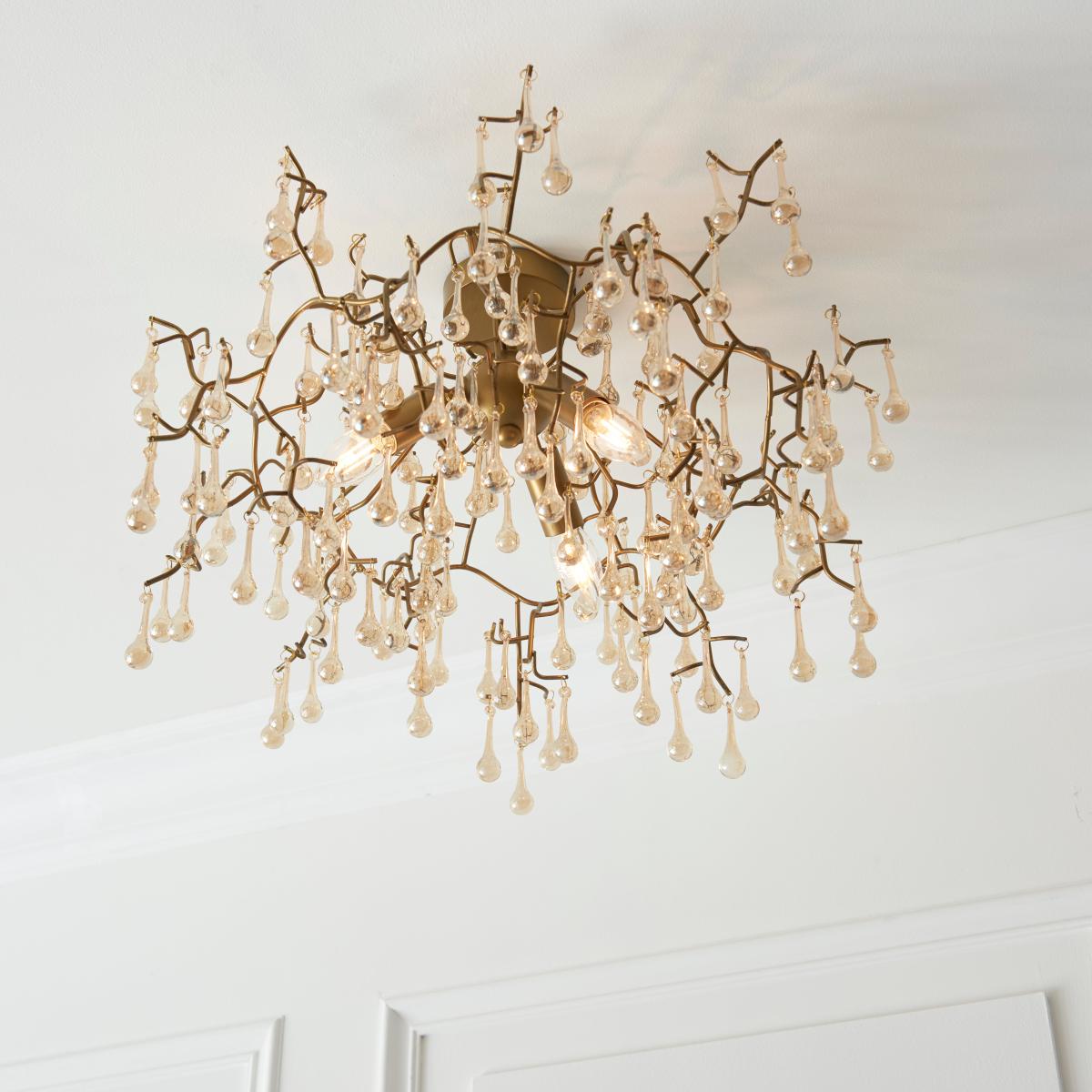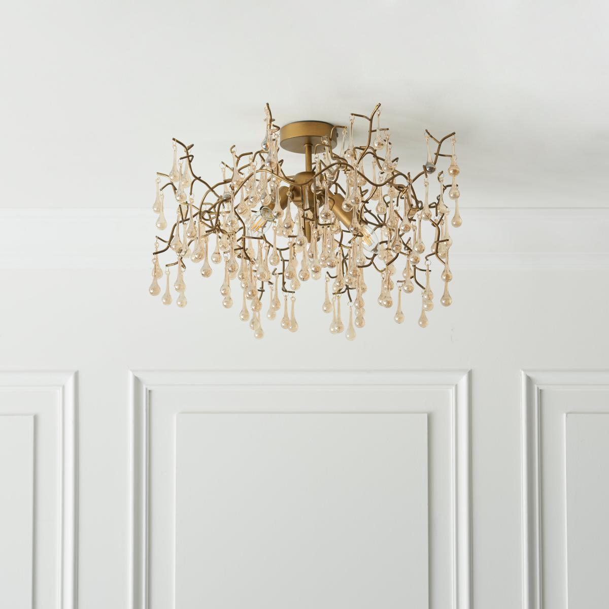 This traditional gold and silver finish 3 light ceiling fitting is inspired by the image of dew drops forming on branches. Adorned with multiple champagne gold or silver lustre finish glass droplets suspended around a handmade metal sculpture for a beautifully perfect decorative light. This flush fitting is compatible with a dimmer switch so you can set the perfect ambience no matter the occasion.