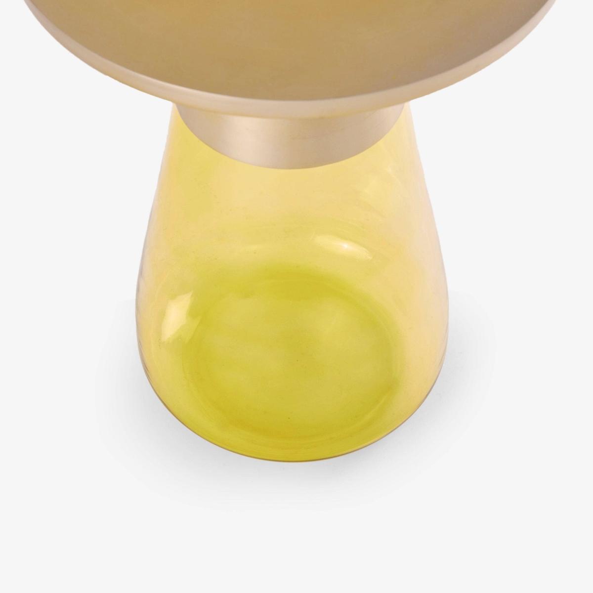 Add a pop of colour and gloss to your living space with our vibrant Volare side table. This stylish living room table, with its blown glass base and brass-hued top, reflects light to boost mood instantly. With its transparent, tinted glass base and brass tray top, this piece has a sculptural presence in any room. The metal of the connecting part is treated with the same process as the tray, creating a streamlined appearance that also offers strong bearing capacity.