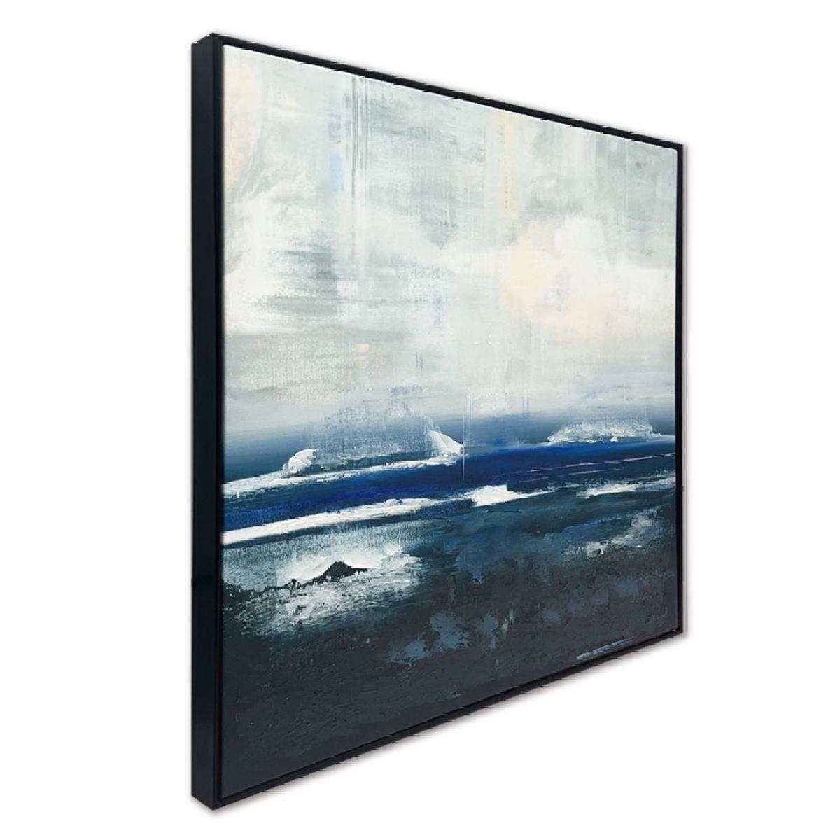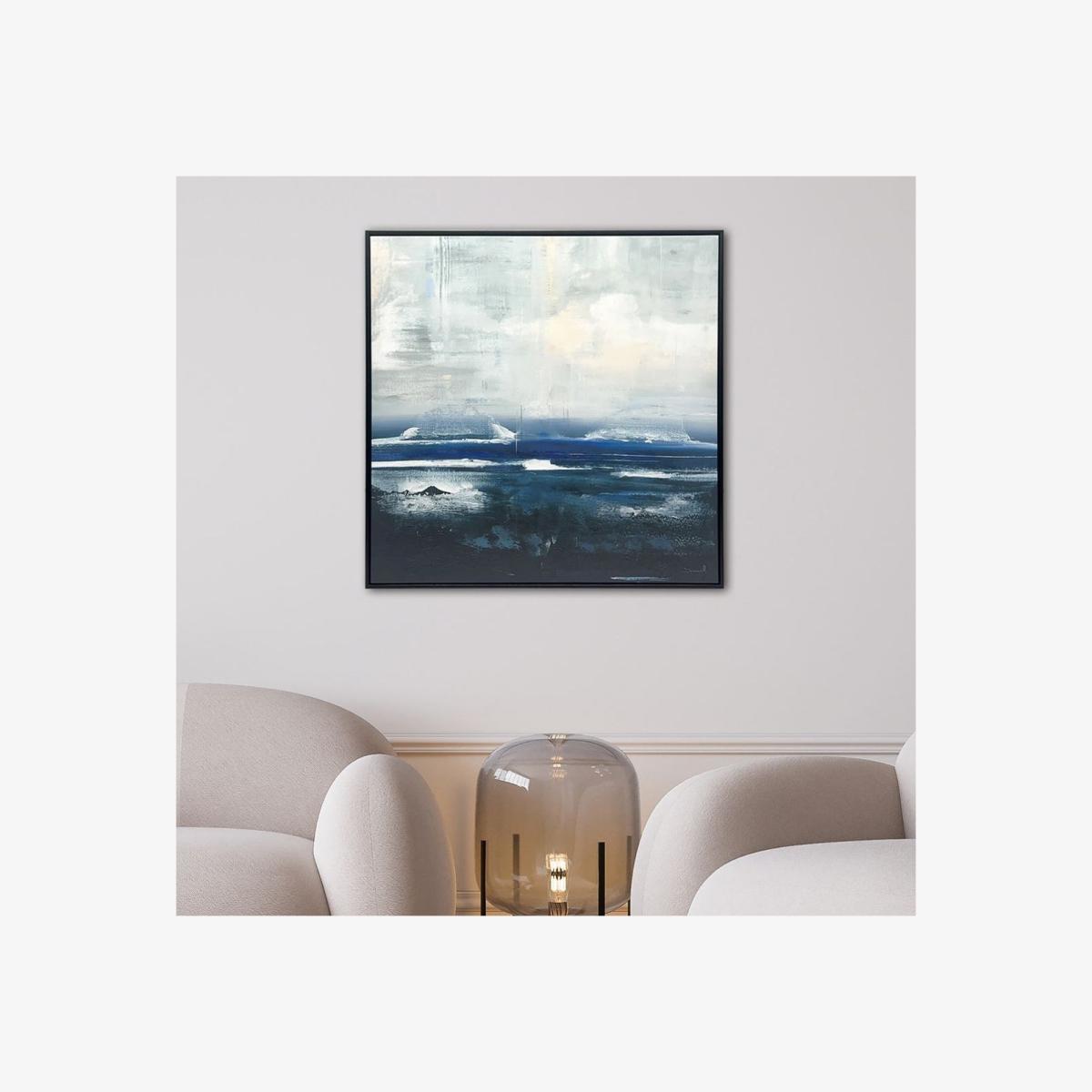 Framed canvas print wall art by Soozy Barker, paired with a black frame and hand-painted embellishments. Bring the raw beauty of nature into your space with , a captivating canvas print by Soozy Barker. Featuring a contemporary, abstract design, this artwork uses a moody colour palette of dark blues and light greys to evoke the dramatic power of the coastline. Hand-painted embellishments add subtle texture and dimension, creating a dynamic, tactile surface that draws the eye.  Its striking composition adds a sense of depth and mystery, making it a perfect piece for creating a bold, atmospheric ambiance in any room.