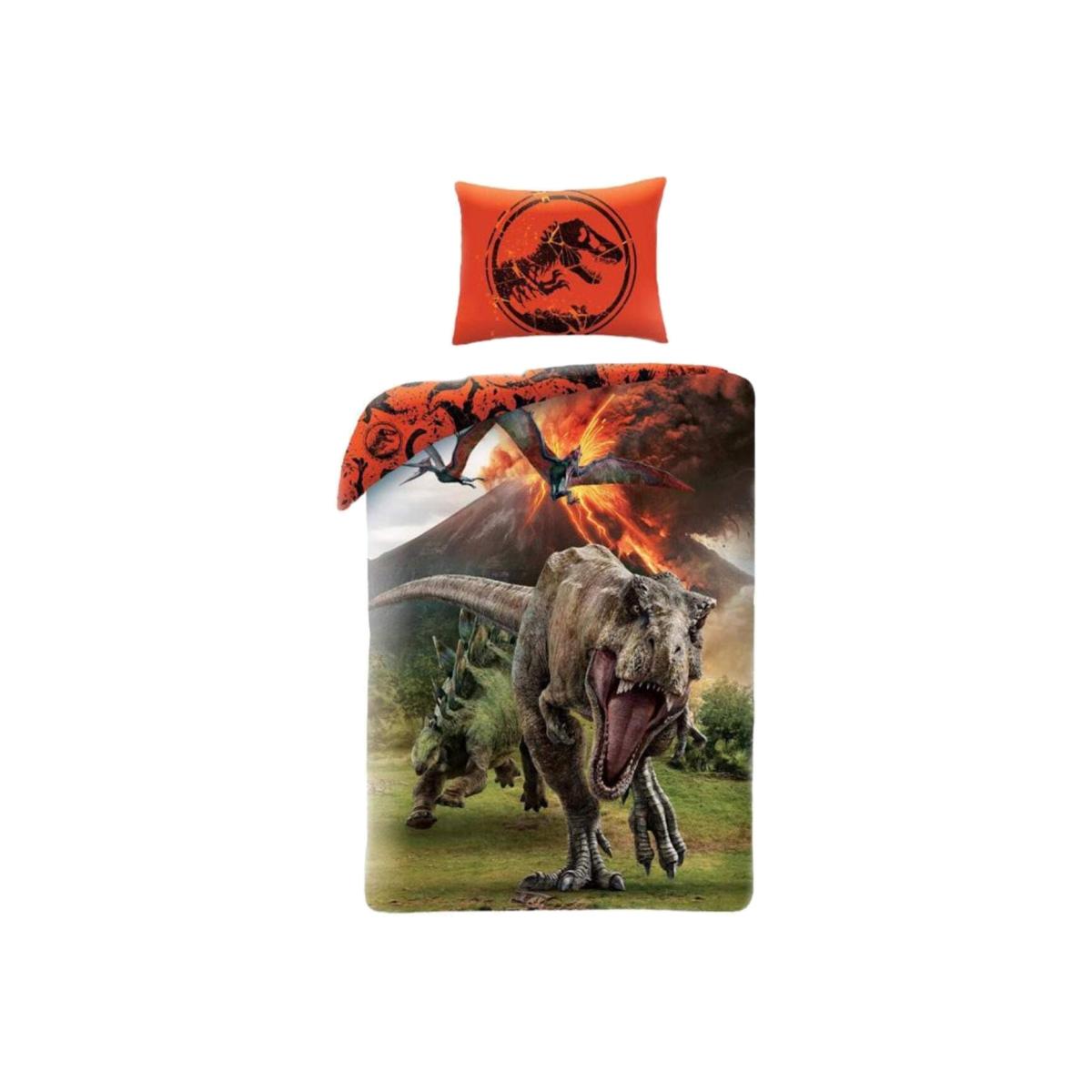 This Jurassic World single duvet cover and pillowcase set is perfect for any dinosaur fans. The stunning design features a detailed image of a T-Rex, Stegosaurus and Pterodactyls fleeing an erupting volcano on an outdoor themed backdrop, while the reverse has a repeat pattern of dinosaur silhouettes and the Jurassic World logo in black on an orange background. This zip-closing bedding set is 100 cotton and can be machine washed and tumble dried on a low setting.