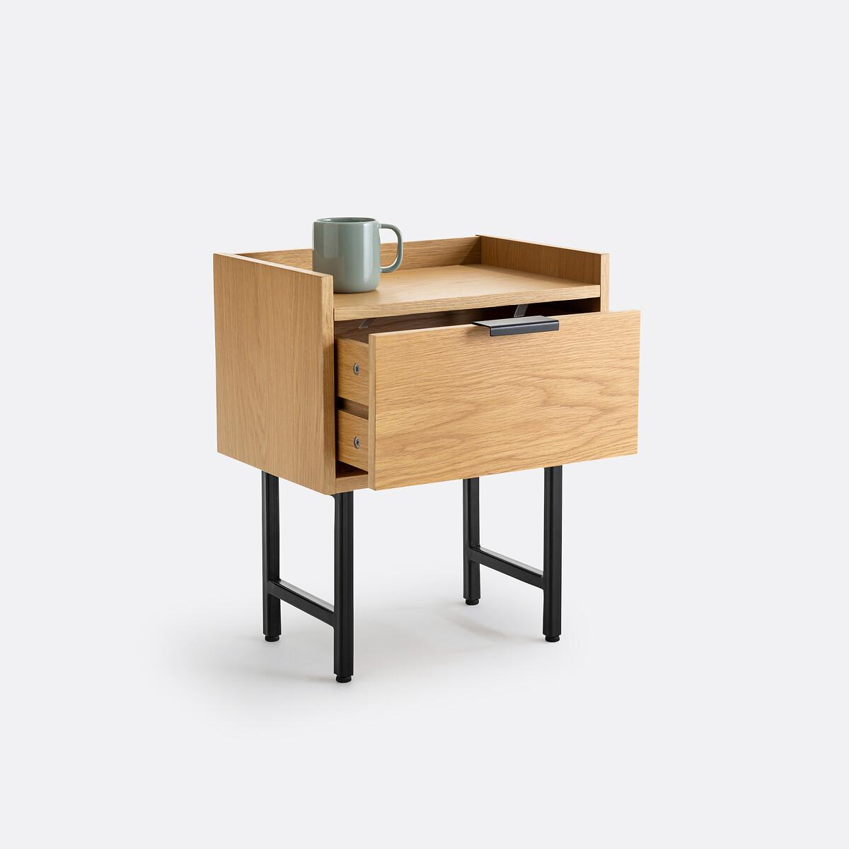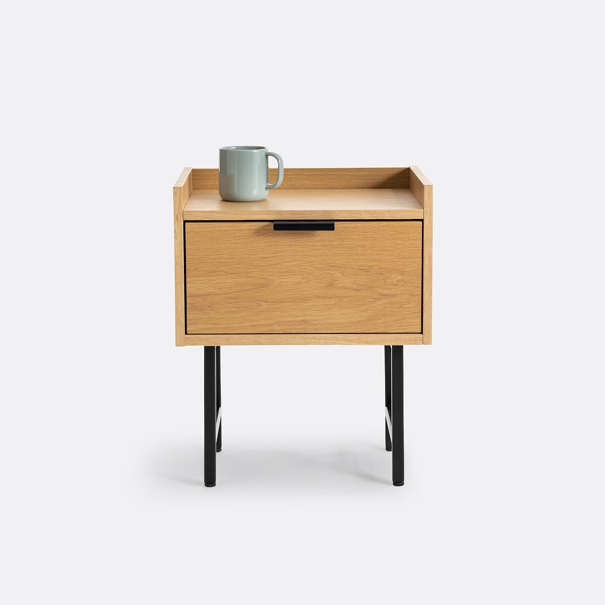 You'll know the modern Volga collection by its straight and clean lines. We love the combination of wood and metal. It will take pride of place in your bedroom. Product Details • 1 drawer • Oak veneered MDF cabinet with NC varnish finish • Base and handle in epoxy-coated metalDimensions. Overall • Width 43cm • Height 52cm • Depth 30cm. Inner drawer dimensions • L35.3 x D23.4 x H13.6 cmDelivery:. This product requires assembly. Available for home delivery. Note! Please check that all access points are large enough to accommodate your delivery (doors, stairs, lifts). • WOOD FROM SUSTAINABLY MANAGED FORESTS. FSC® certified wood comes from forests that are environmentally, socially and economically well managed. Dimensions and weight of parcel1 parcel • L52 x H40 x D21.5 cm. Weight 12kg