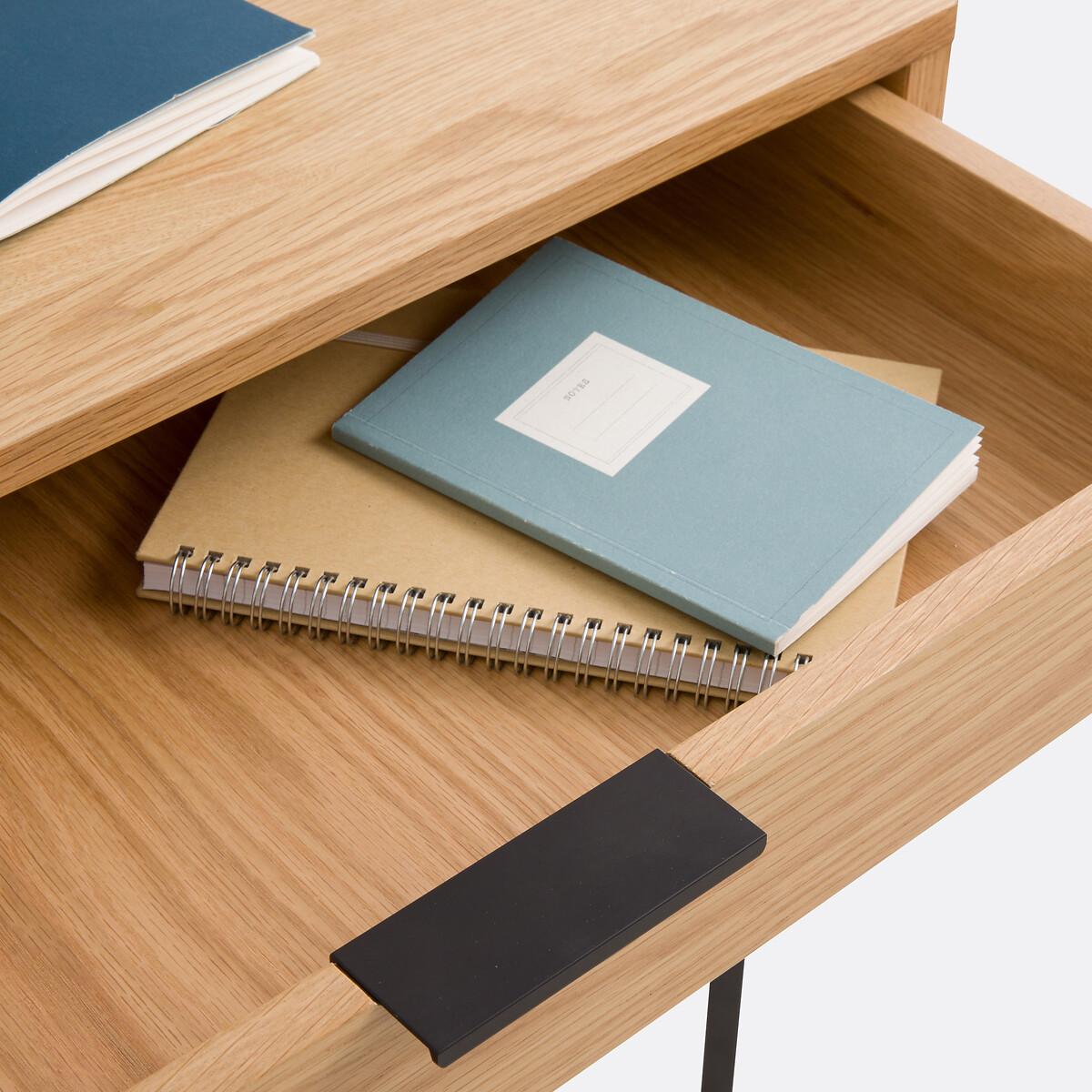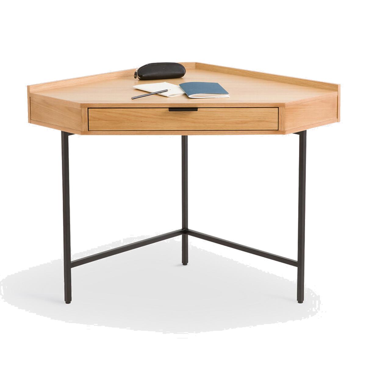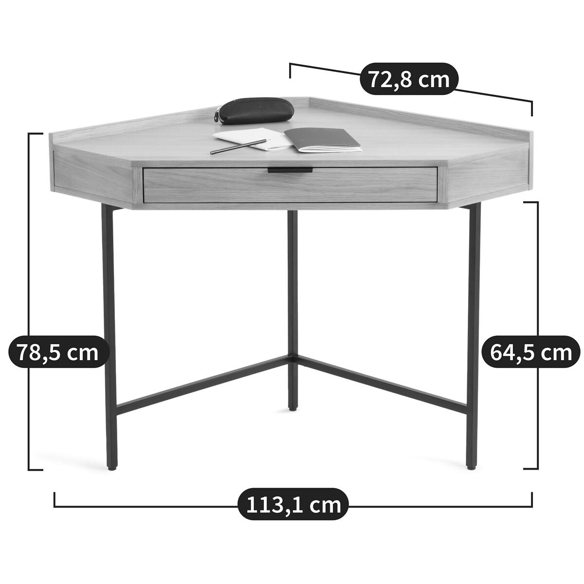 The Volga corner desk perfectly combines the warmth of wood and the modernity of metal. This clever piece of furniture fits easily into the odd corners of a room. Perfect for small spaces. Contemporary in style, it will find its place in any interior. Designed by La Redoute Interiors. Product Details • FSC® oak veneered MDF box, nitrocellulose varnish finish • 1 drawer with epoxy-finish steel handle • Steel legs with epoxy finishDimensions. Overall • Width: 113.1cm • Height: 78.5cm • Depth: 72.8cm • Weight: 23kg. Usable space • Drawer: L61.4 x H5.6 x D35.4cm • Table height: 76cm • Height of legs: 64.5cmDelivery:. Assembly required. Available for home delivery. Note! Please check that all access points are large enough to accommodate your delivery (doors, stairs, lifts). • WOOD FROM SUSTAINABLY MANAGED FORESTS. FSC® certified wood comes from forests that are environmentally, socially and economically well managed. Dimensions and weight of parcel1 parcel • L90 x H23 x D90cm. 27kg