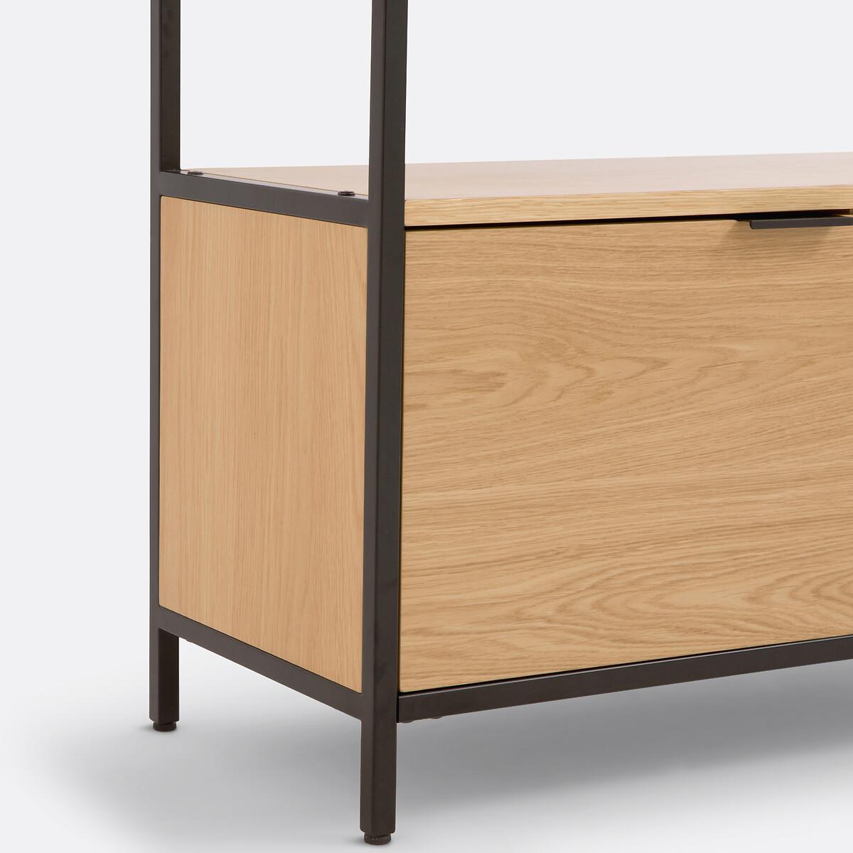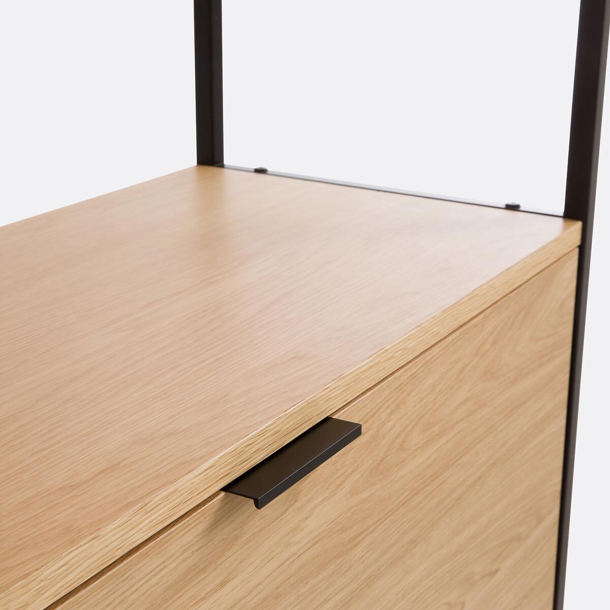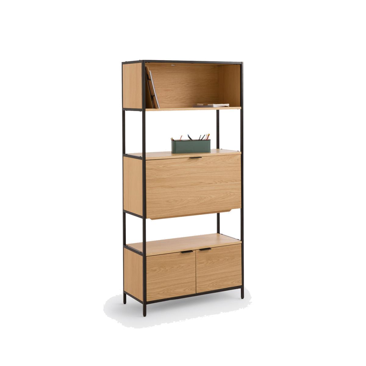 The Volga shelving desk combines oak and steel in a contemporary style. Its top unfolds and offers a nice workspace. Once closed, it will keep your documents and other personal items out of sight.. Functional, it has a large compartment and a unit that offer a helpful storage space. Designed by La Redoute Intérieurs. Product Details • Desk unit with folding top • Unit with 1 large open compartment at the top, 1 2-door box with 2 compartments at the bottom • In nitrocellulose-coated oak veneered MDF and epoxy-coated steel • Fixes to the wall • To be associated with the shelves of the same rangeDimensions. Overall • Width: 90cm • Height: 190cm • Depth: 37cm (closed) • Height of legs: 8cm/3" • Weight: 64kg. Usable dimensions: • Compartment inside the folding top: L86 x H42.1 x D32.2cm • Compartment down behind the door:L42.2 x H34.1 x D32.2cm • Assembly required. • WOOD FROM SUSTAINABLY MANAGED FORESTS. FSC® certified wood comes from forests that are environmentally, socially and economically well managed. Dimensions and weight of parcel2 parcels • L211 x H16 x D47cm. 33kg • L96 x H21.5 x D54cm. 39kg