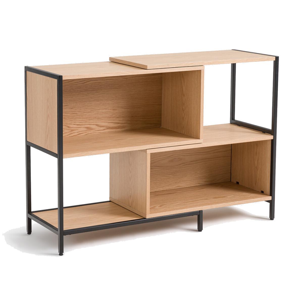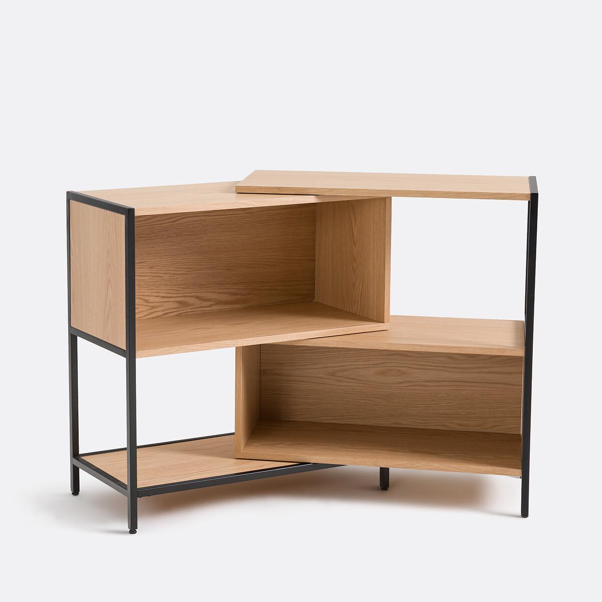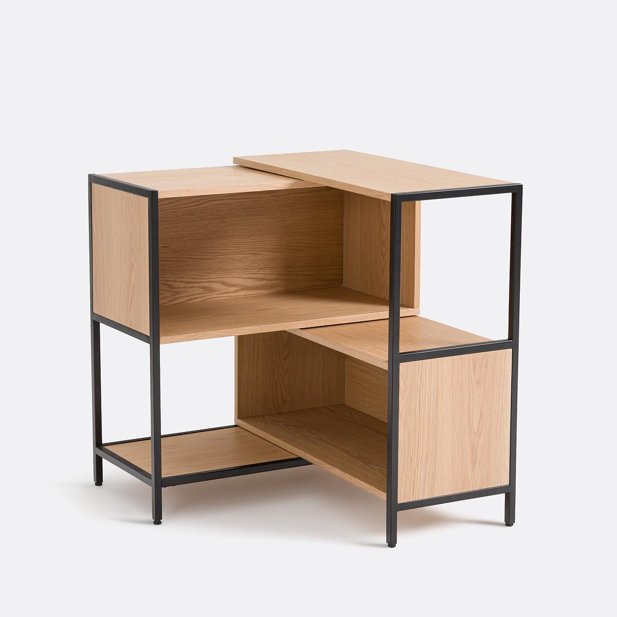 The Volga reversible console table is part of our Les Ingénieux collection. Creations full of ideas to make life simpler and everyday life more beautiful, imagined by our designers in France..Changing the interior without changing everything, what we all dream of. With The Volga, the dream becomes a reality. It can be transformed to how you want it. It extends and folds into a corner unit to enhance its use. What a way to reinvent your interior in a few simple movements. Why you'll love it • Really flexible: 3 possible variations to adapt to all interiors. • 2 shelves, deep but not too deep : designed for books but with space for other items • The marriage of metal and oak veneer: to suit all styles. Product Details • 2 open compartments in oak veneered MDF with nitrocellulose finish • Base and rails in black iron with epoxy finish • Polypropylene adjustable glides • Sliding and foldable • Wall-mounting system (screws and plugs not supplied) • People required for assembly: 2Dimensions. Overall • Width: 75/125cm • Height: 84cm • Depth: 37cm • Height of legs: 8cm/3" • Weight: 38kg. Usable space • Left-hand compartment: L76 x H34 x D35cm • Right-hand compartment: L74 x H30 x D35cm • This product requires assembly. • WOOD FROM SUSTAINABLY MANAGED FORESTS. FSC® certified wood comes from forests that are environmentally, socially and economically well managed. Dimensions and weight of parcel2 parcels • L100 x H20 x D47cm. 23kg • L95 x H16 x D47cm. 23kg