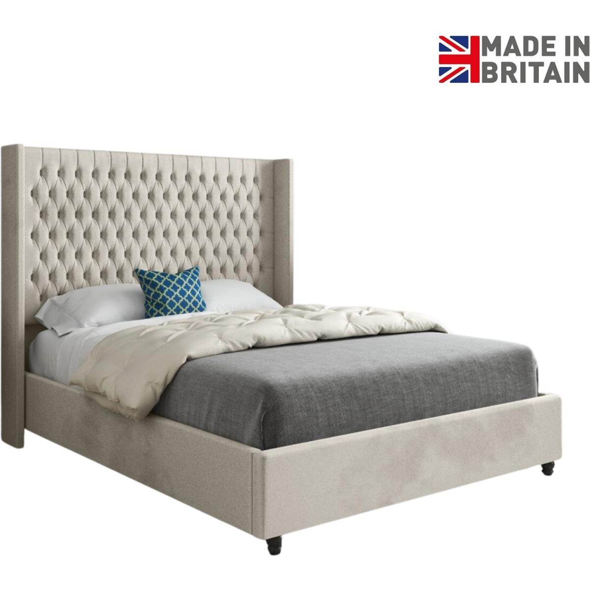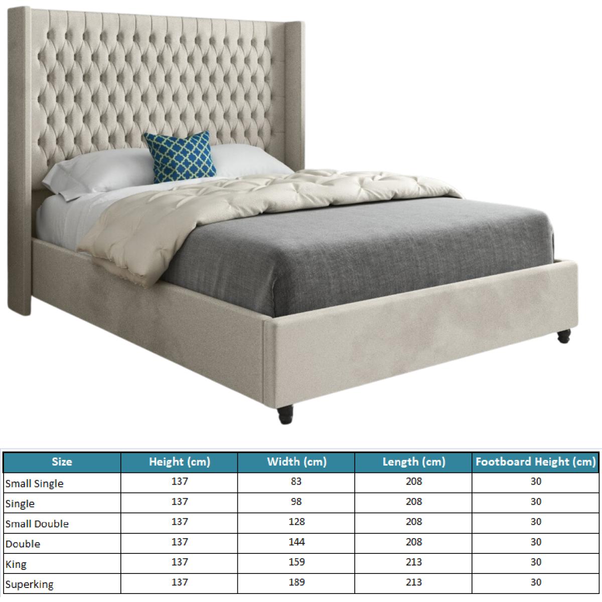 A luxurious design, the Volta upholstered bed frame features a deep buttoned headboard with stunning winged sides. Designed with premium fabric this elegant bed frame has a subtle welcoming feel that will complete your bedroom. The tall headboard is complimented by a matching upholstered base, making it a spectacular statement in any bedroom. The bed frame is finished off with classic wooden feet which complements the traditional pleated upholstery design. Each night youll be supported by a solid slatted base for extra comfort, support and circulation of air, ensuring you get a rejuvenating nights sleep every evening.
