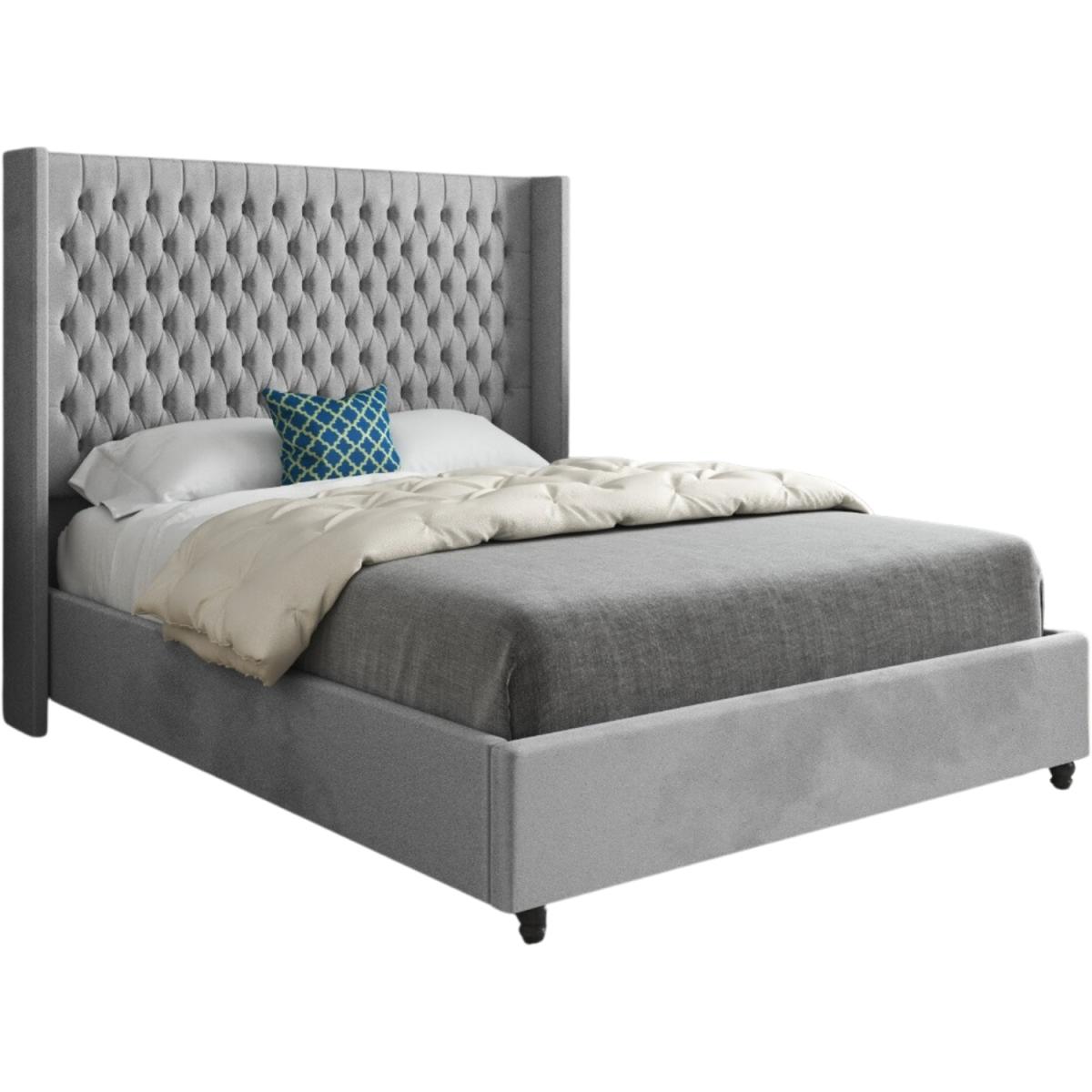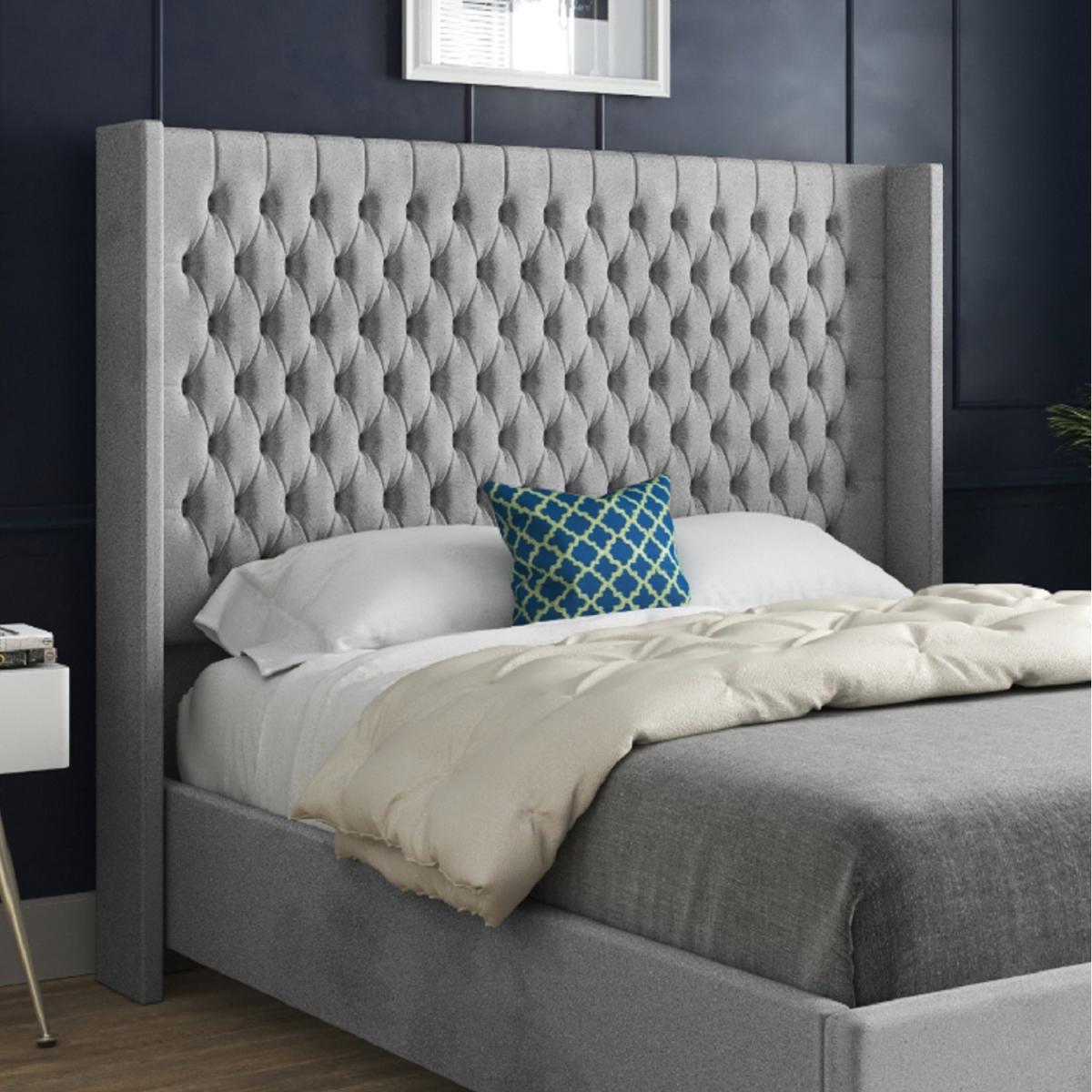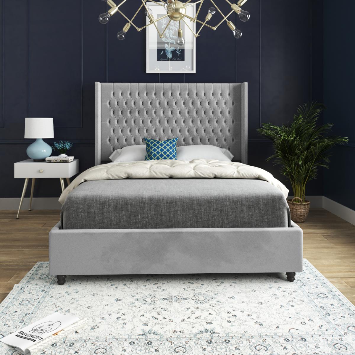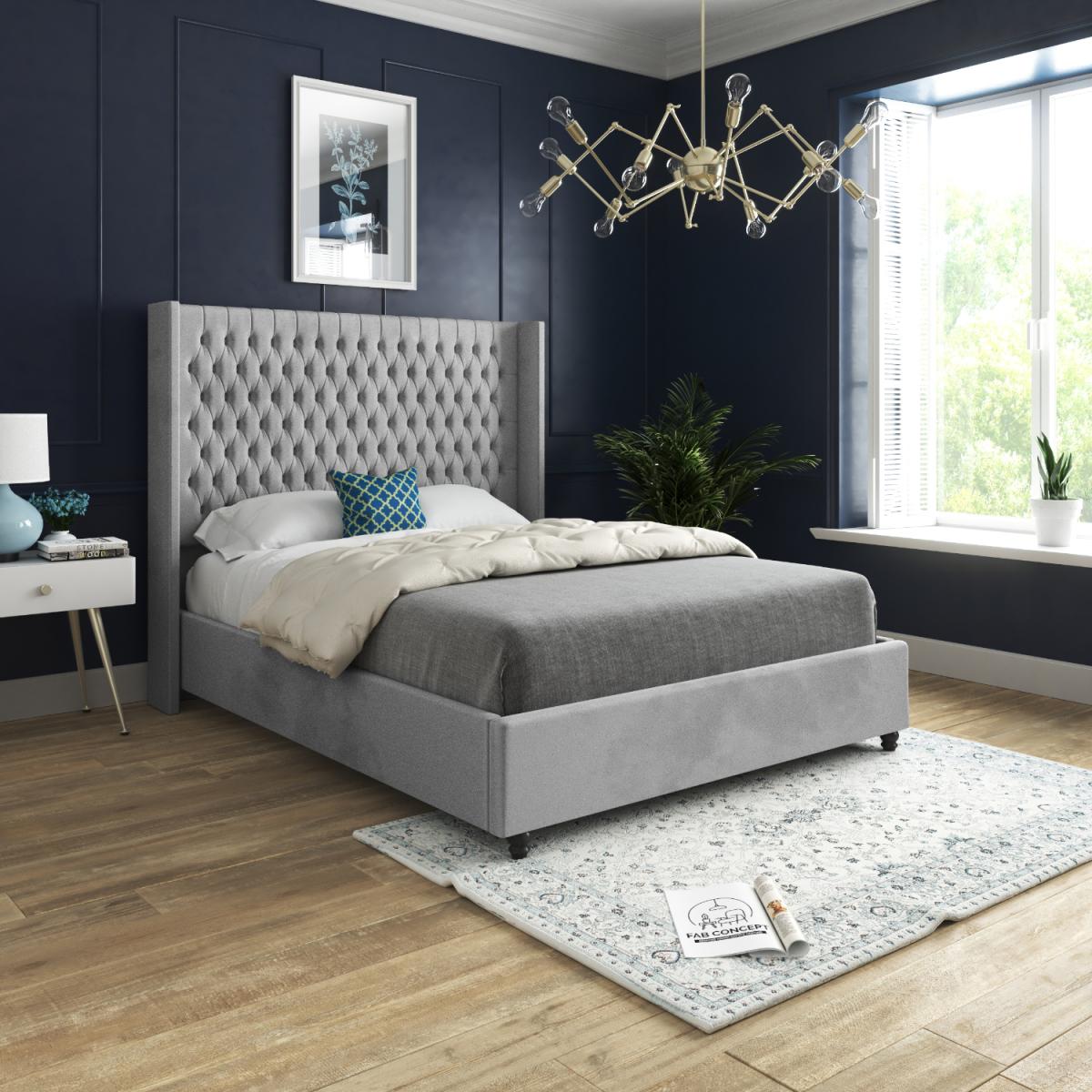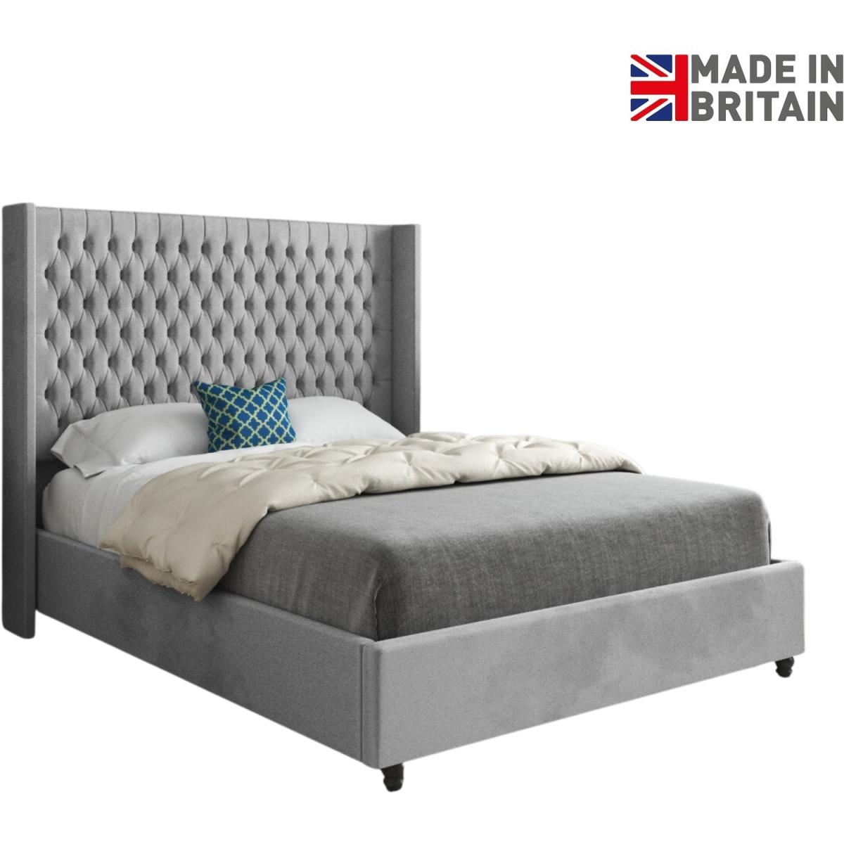 A luxurious design, the Volta upholstered bed frame features a deep buttoned headboard with stunning winged sides. Designed with premium fabric this elegant bed frame has a subtle welcoming feel that will complete your bedroom. The tall headboard is complimented by a matching upholstered base, making it a spectacular statement in any bedroom. The bed frame is finished off with classic wooden feet which complements the traditional pleated upholstery design. Each night youll be supported by a solid slatted base for extra comfort, support and circulation of air, ensuring you get a rejuvenating nights sleep every evening.