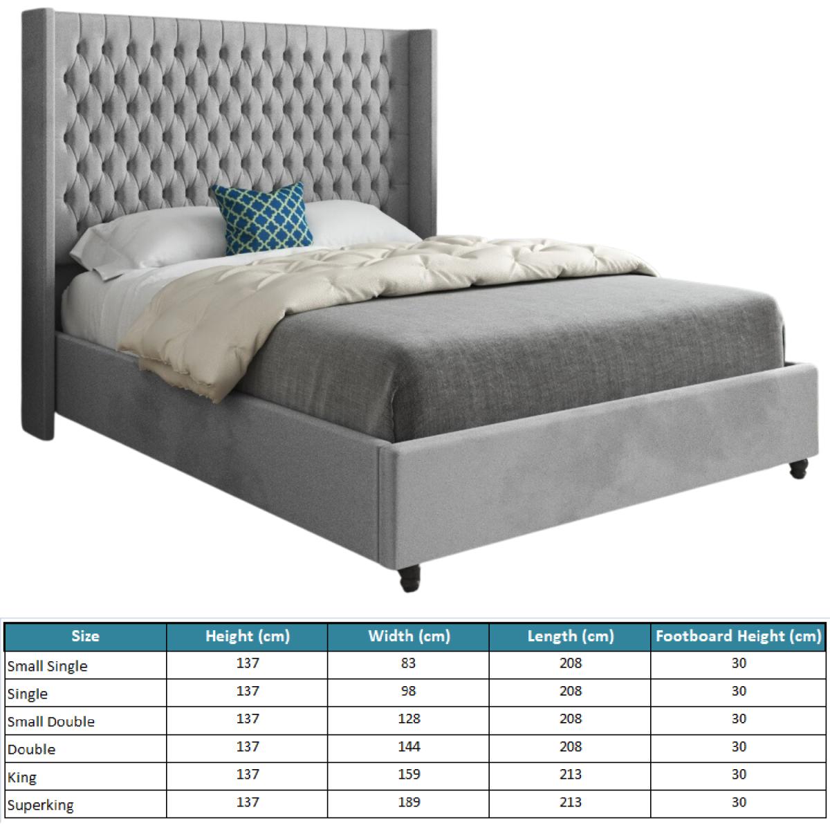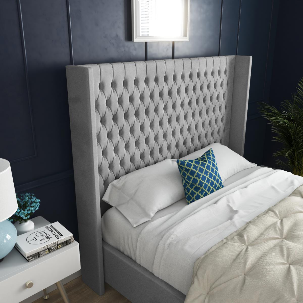 A luxurious design, the Volta upholstered bed frame features a deep buttoned headboard with stunning winged sides. Designed with premium fabric this elegant bed frame has a subtle welcoming feel that will complete your bedroom. The tall headboard is complimented by a matching upholstered base, making it a spectacular statement in any bedroom. The bed frame is finished off with classic wooden feet which complements the traditional pleated upholstery design. Each night youll be supported by a solid slatted base for extra comfort, support and circulation of air, ensuring you get a rejuvenating nights sleep every evening.