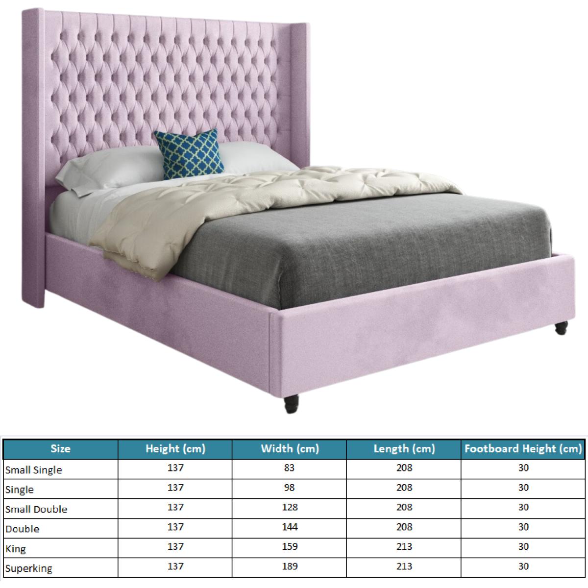 A luxurious design, the Volta upholstered bed frame features a deep buttoned headboard with stunning winged sides. Designed with premium fabric this elegant bed frame has a subtle welcoming feel that will complete your bedroom. The tall headboard is complimented by a matching upholstered base, making it a spectacular statement in any bedroom. The bed frame is finished off with classic wooden feet which complements the traditional pleated upholstery design. Each night youll be supported by a solid slatted base for extra comfort, support and circulation of air, ensuring you get a rejuvenating nights sleep every evening.