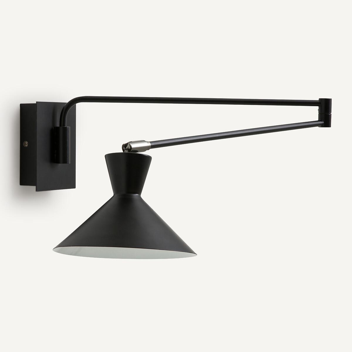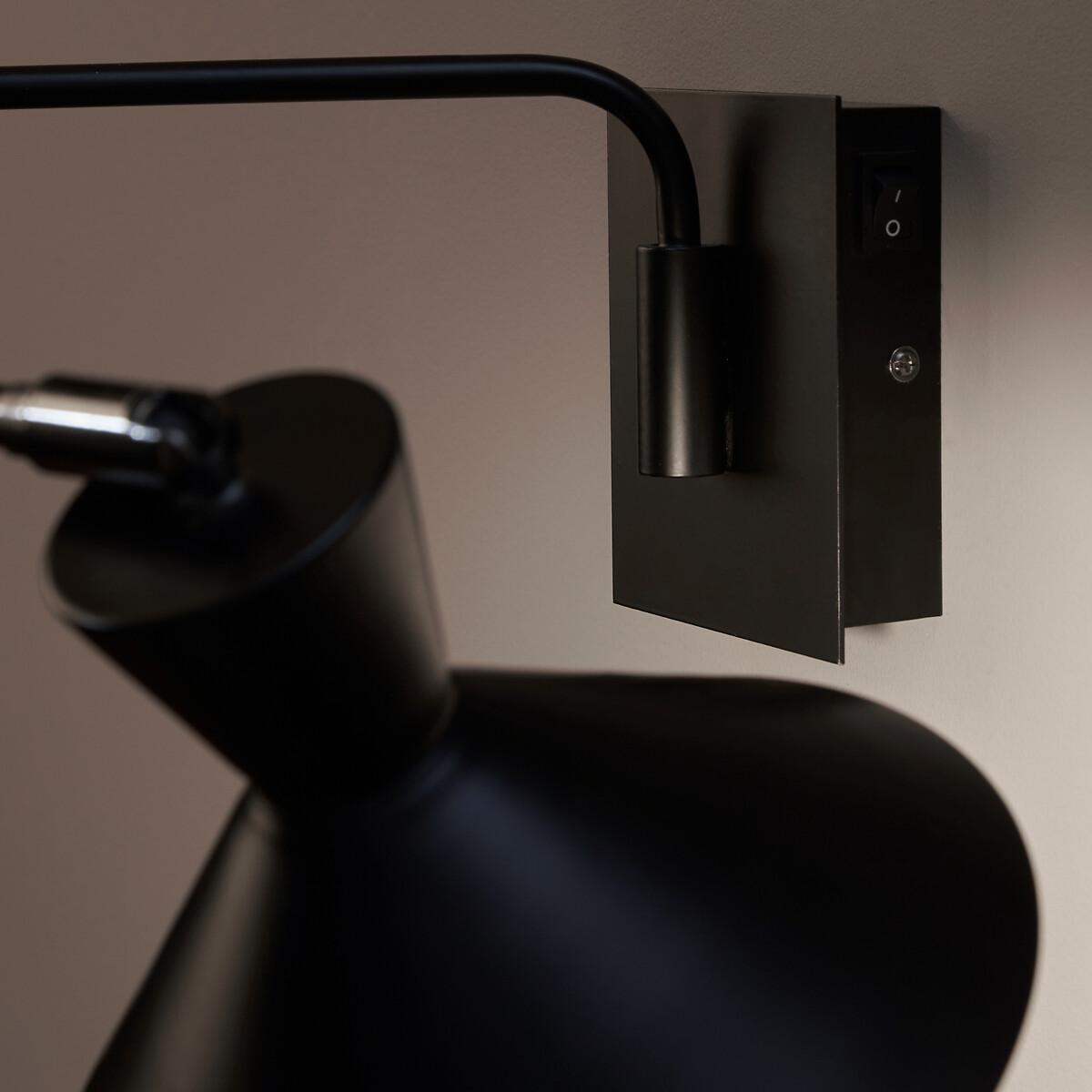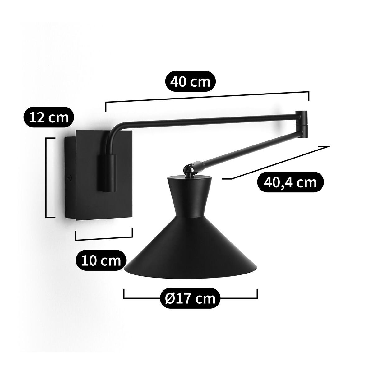 The articulated wall light. An elegant and sober style, coupled with a functional design. Its articulated arm it allows directional light. Product Details • In epoxy-finished iron • Switch on the wall plate • Supports E14 bulb, 11w max (not supplied) • Compatible with energy class A bulbs. Dimensions • Lampshade:Diameter 17cm • Base: Length 12cm x Width 10cm, Thickness 3.5cm • Arm length: 40cm, 2nd arm 40.4cm • Ball diameter 2cm • Maximum span: 99.6cm