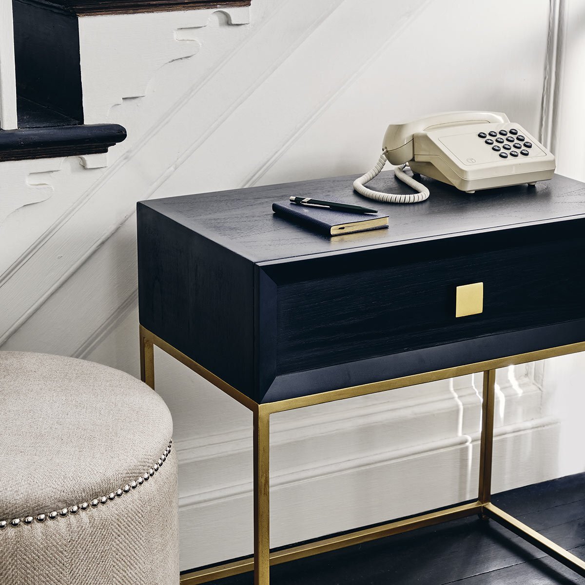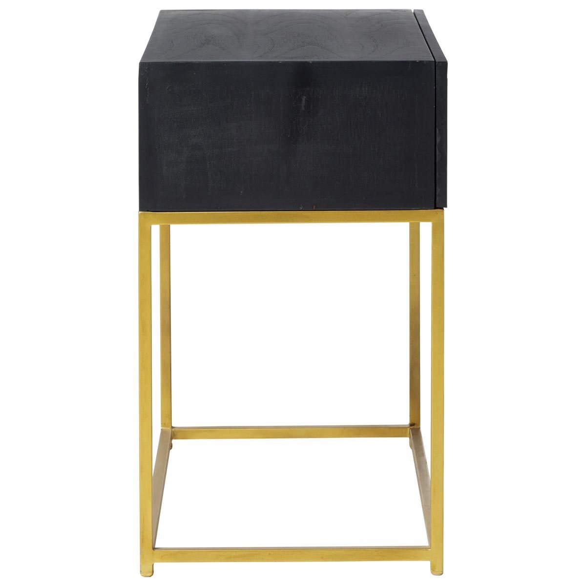 This side table is a sleek addition that works particularly well in contemporary or minimalist interiors, thanks to its striking black finish and elegant gold frame. I love how the ebony surface adds depth and sophistication, making it a versatile piece that can complement monochrome schemes or serve as a statement against lighter colour palettes. To style it effectively, consider placing a decorative lamp, a small vase of fresh flowers, or a favourite book on top. Its compact size makes it ideal for beside a sofa or bed, while the drawer provides practical storage for essentials, keeping the surface tidy. Overall, it’s a functional yet stylish option that can elevate the look of any living space.