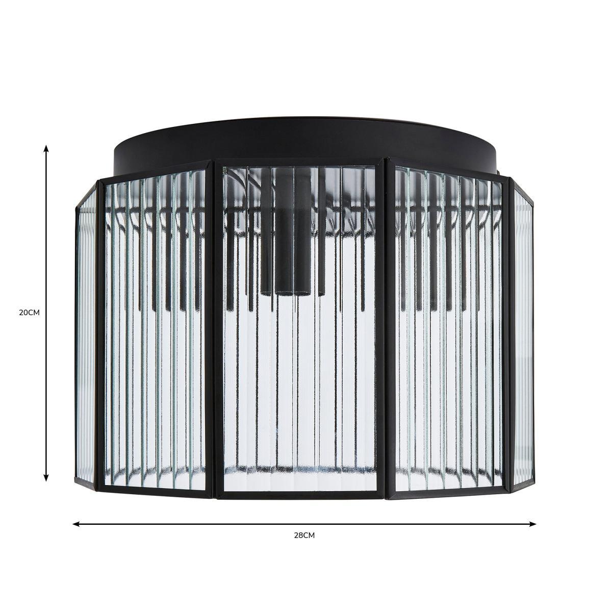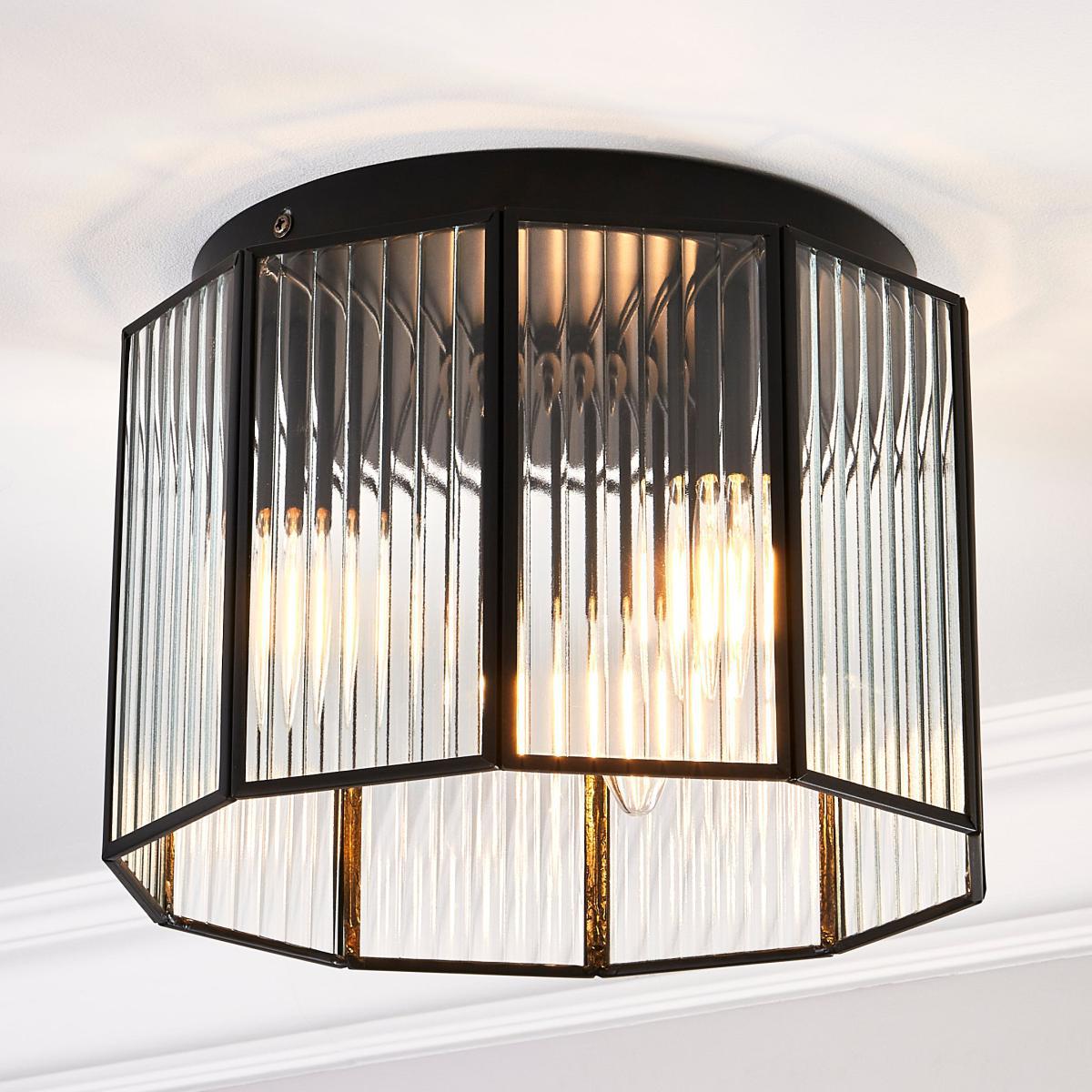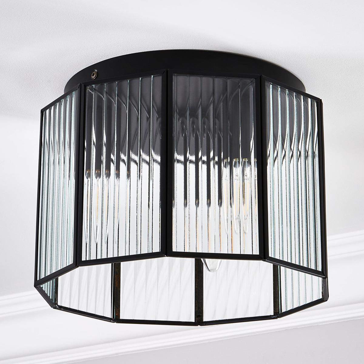 Featuring luxe ribbed glass and a black metal painted frame, our Voss Flush Ceiling Fitting is ideal for adding a contemporary focal point into your room. This ceiling fitting requires 3 x Candle SES (E14) - 4W LED which is not included with the light. A 2-year guarantee is provided with this ceiling light.