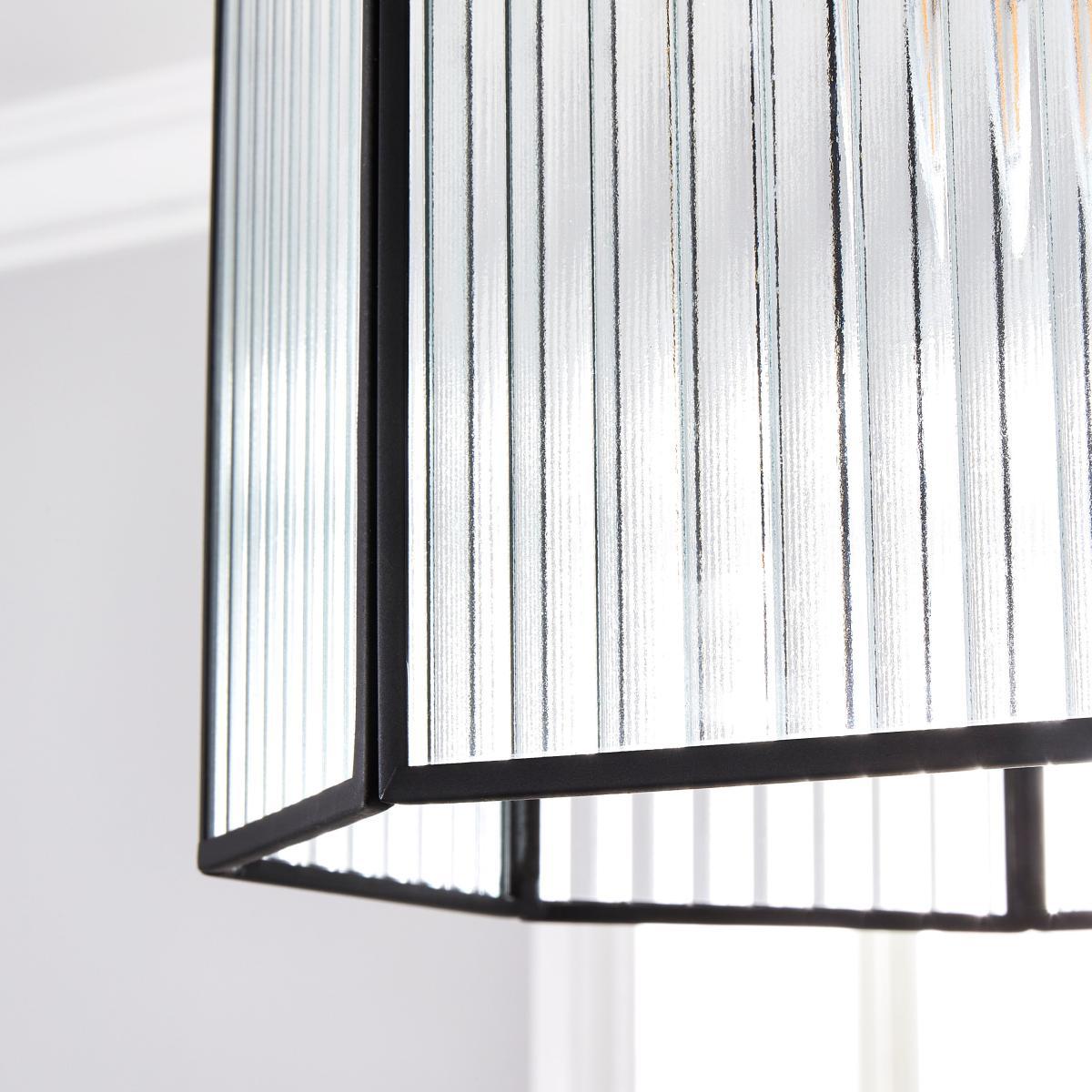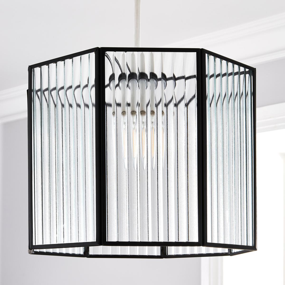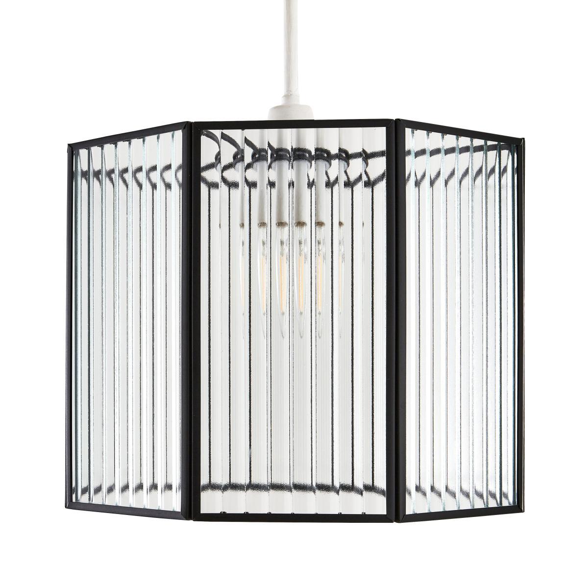 * Easy fit pendant* Black Frame* Clear ribbed class* Luxe look* Matching family items available* 2 year guarantee Featuring the stunning Voss Easy Fit Pendant, crafted with a metal black painted frame coupled with clear ribbed glass panels. This luxurious light pendant will make a striking addition to any room in your home and complement an array of home décor styles. Matching family items from the Voss range are available to help coordinate your home. Easy Fit pendants are ideal for a quick style change without needing an electrician. Simply assemble on to your existing ceiling fitting, and you’re good to go within minutes! Don’t forget to choose the correct bulb for your ceiling fitting.
