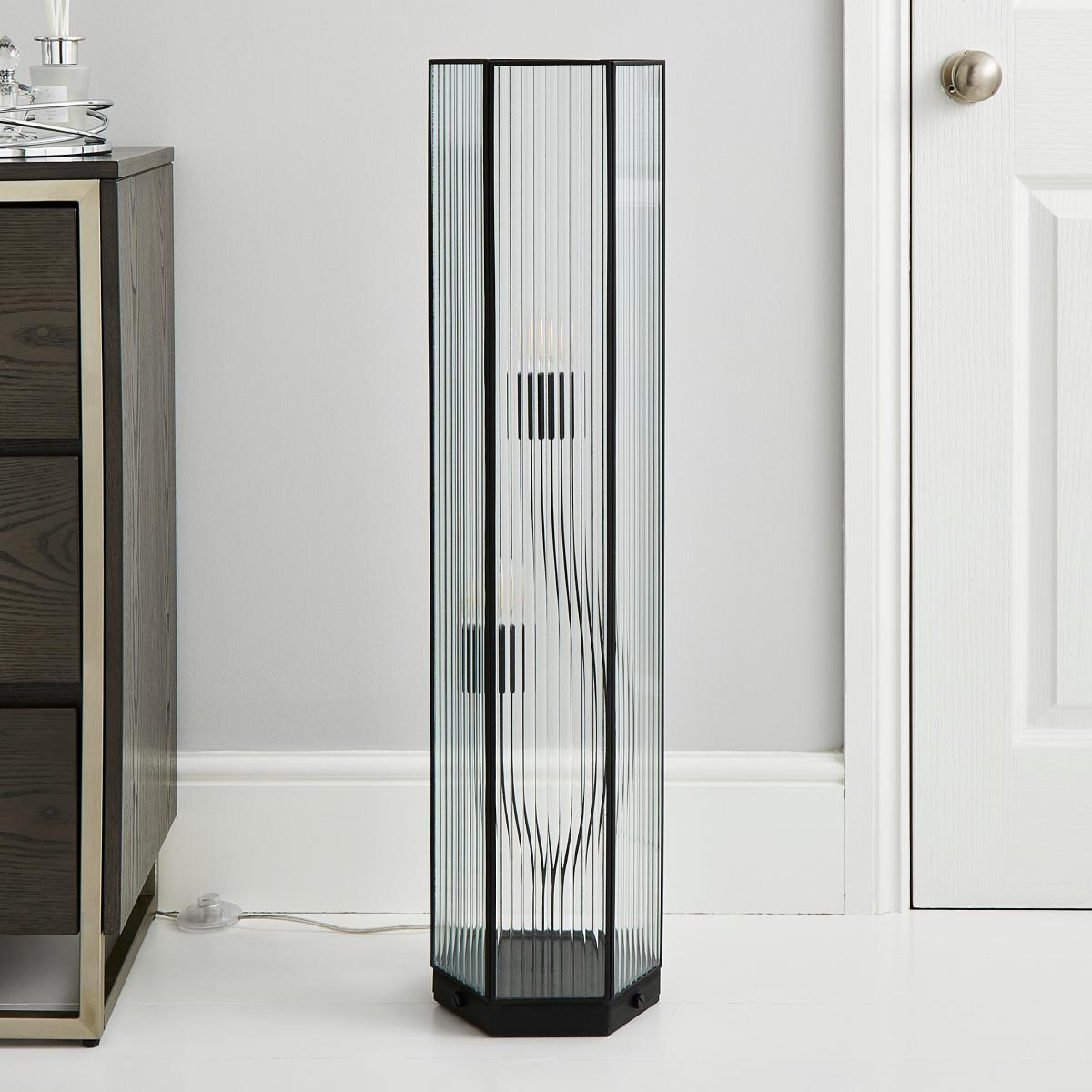 Featuring a luxe look, our Voss 2 light floor lamp boasts ribbed glass with a painted black finished frame. This floor lamp requires 2 x Candle SES (E14) - 4W LED which is not included with the lamp. The floor lamp comes with a 1. 5m cable and a foot switch. A 2-year guarantee is provided with this floor lamp.