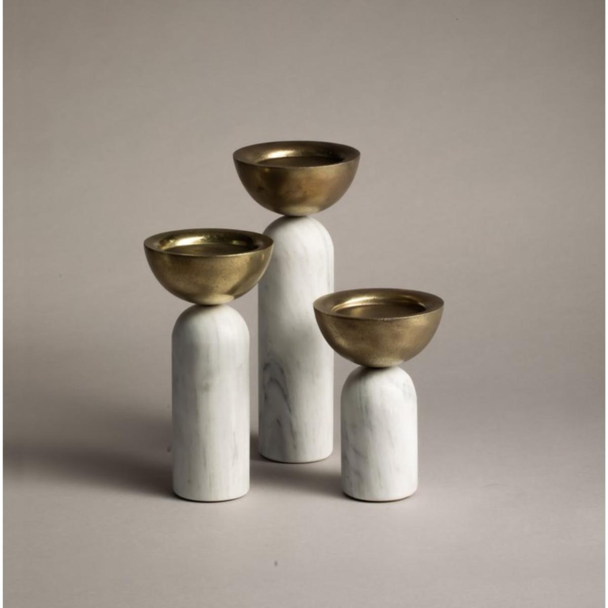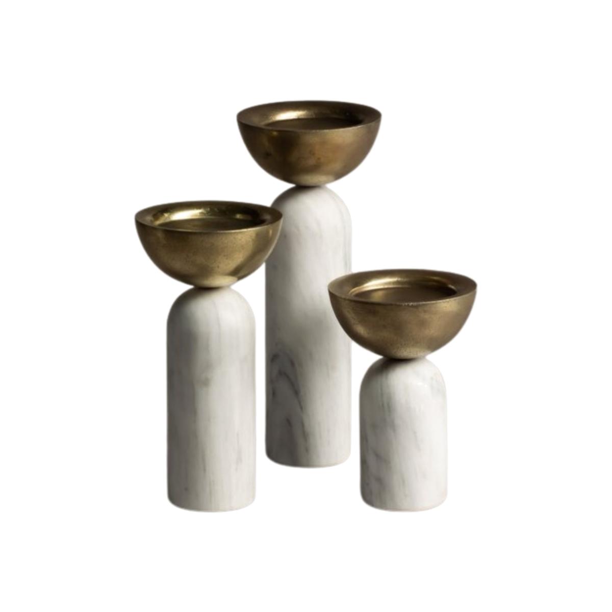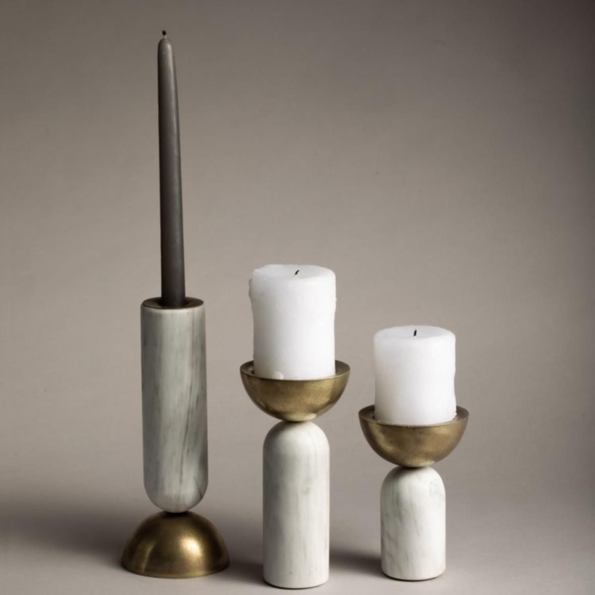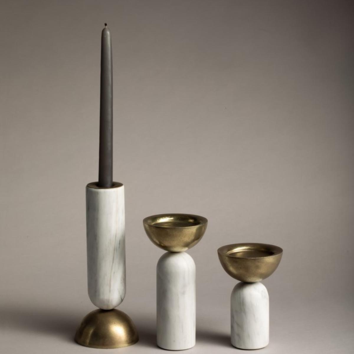 Votive is very versatile and quirky. This marble and particle-smashed brass candle holder has two main forms of use; for votive candle and pilar candle. Available in three different heights. create a composition with the different sizes or choose just one and play with its different ways of use. looks great on any surface. The set consists of one small, one medium and one large Votive Candle Holder
