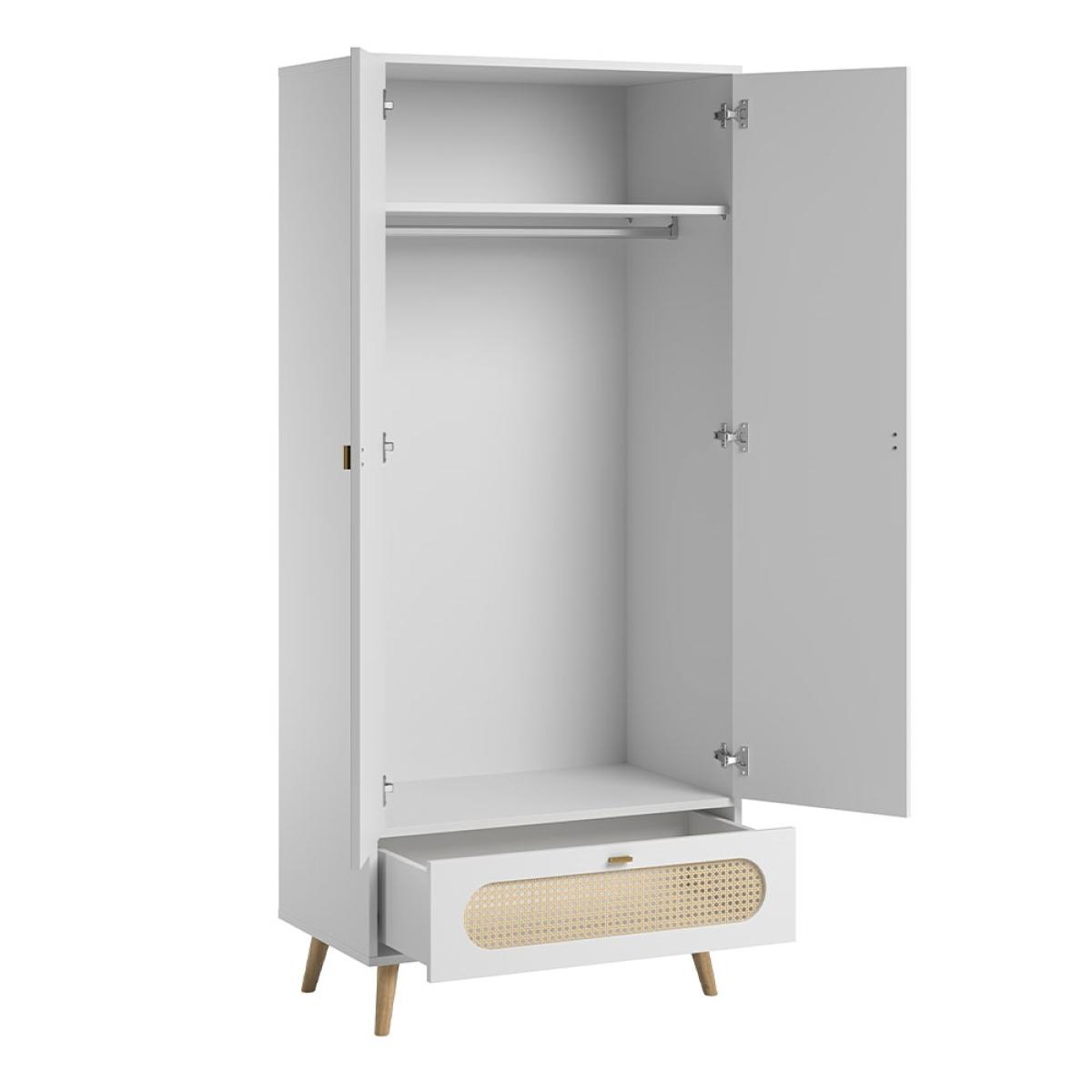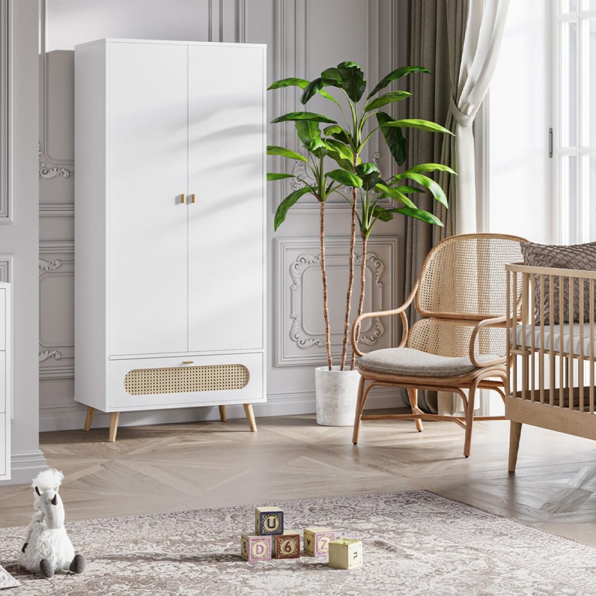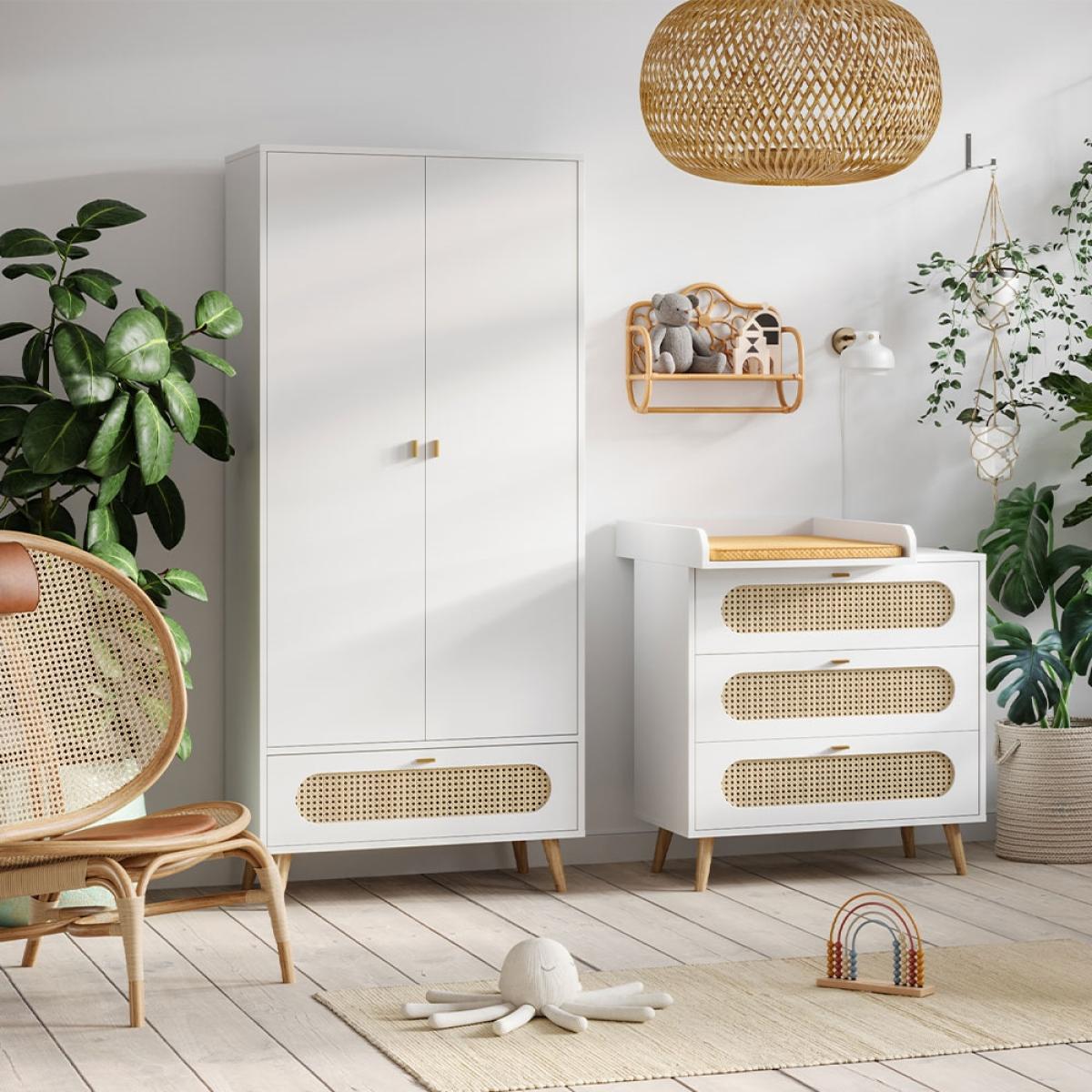Pairing cane rattan webbing with golden handles - the Vox Canne 2 Door Wardrobe is so stylish we can't take our eyes of it! Inside the double wardrobe - store bedding, blankets and boxes on the full width upper shelf and keep outfits crinkle-free with the hanging rail. The cane rattan drawer is great for keeping clothing separate and everyday outfits folded neatly away. This elegant and unique design would look great in your bedroom, kids rooms or the nursery. Add the matching dresser and cot bed and build a beautiful set for your baby. The Canne and coordinating Paris range all come in a choice of colours, so you can mix and match your pieces. Use this boho-style set as a starting point if you're thinking about re-decorating but don't know where to begin, and add complementing furniture and accessories to create an ultra-chic home!.