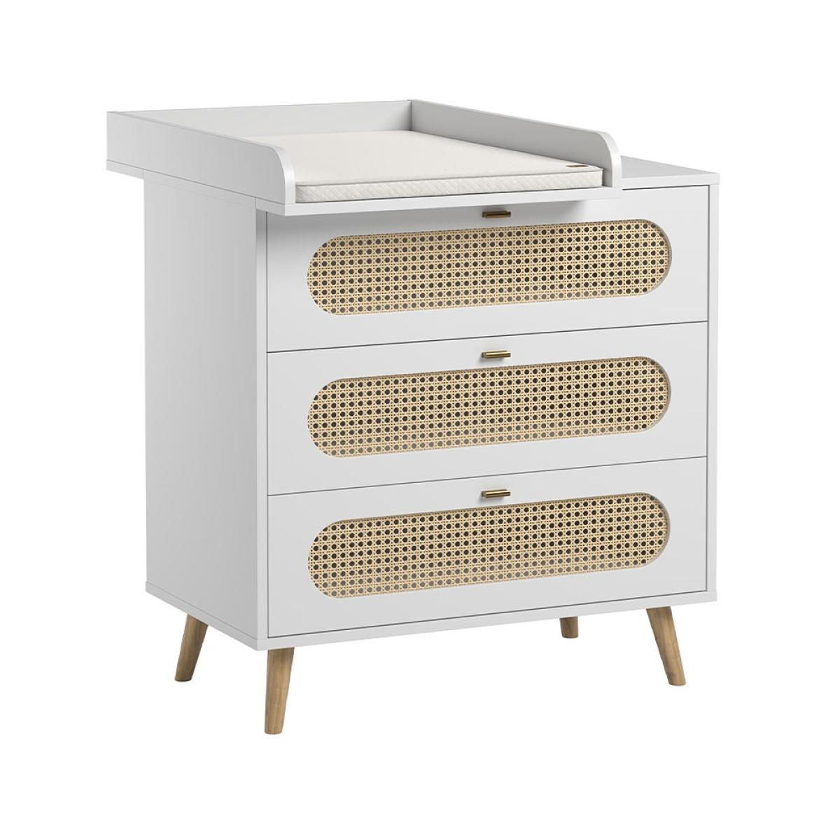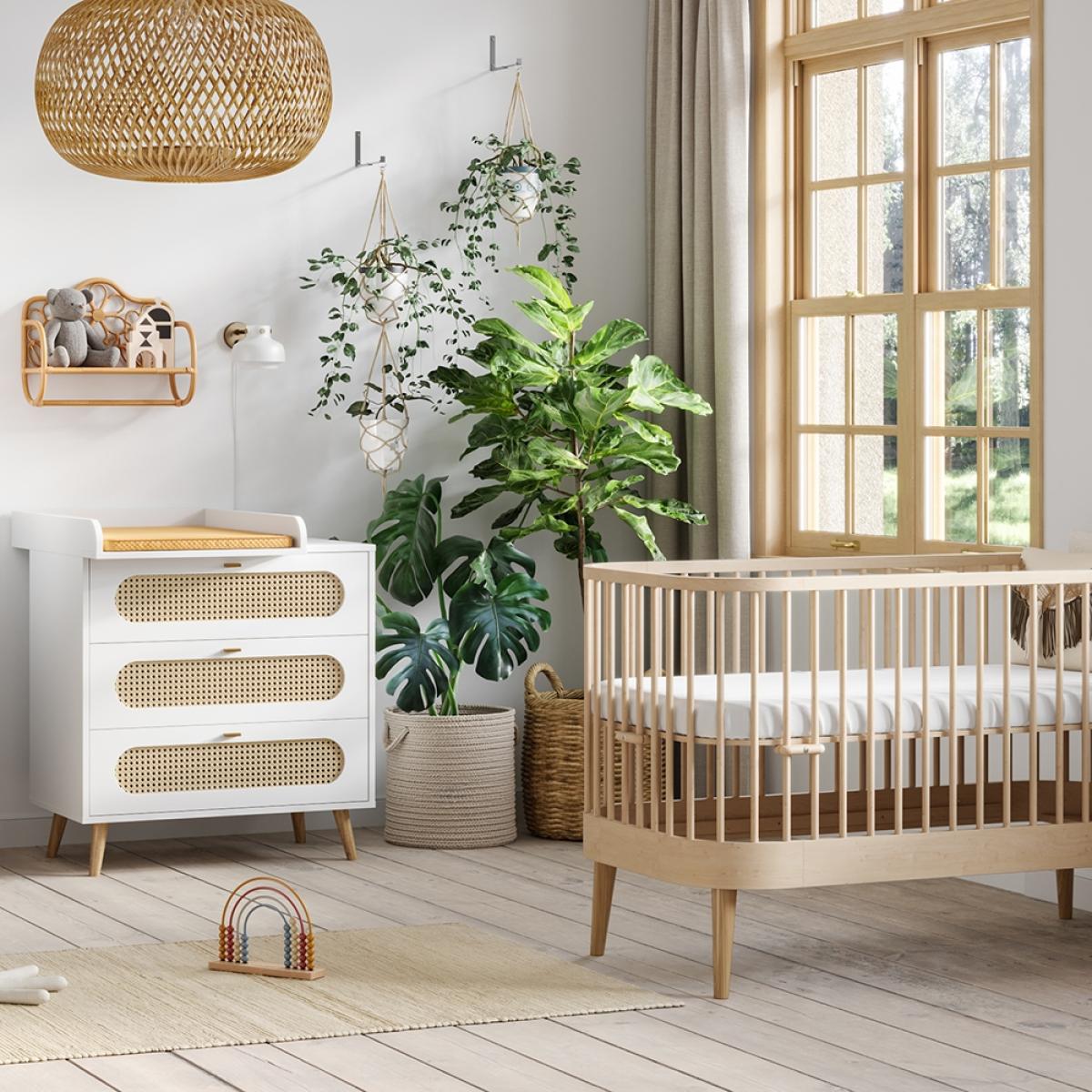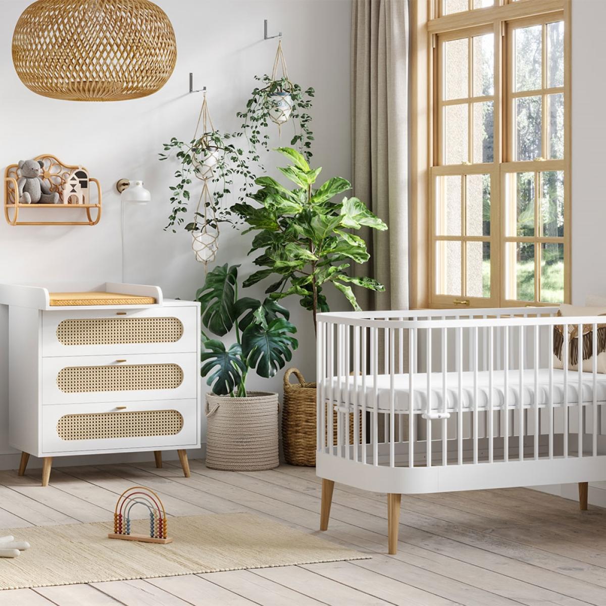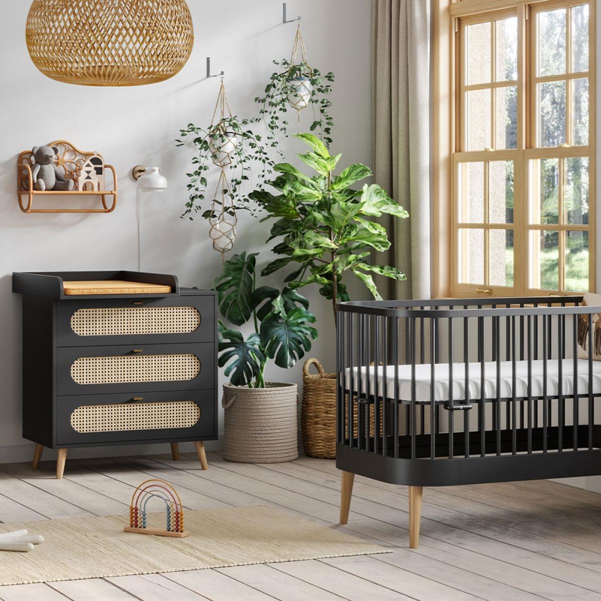 Searching for nursery furniture, but wanting something different? The Vox Canne Baby Cot Bed 2 Piece Nursery Set is something special! Designed with natural wood details, gold details and cane rattan webbing, Vox have perfectly paired retro and contemporary styles. The cane rattan drawers are soft-close, so there's no risk of waking your baby when you've just put them down! Add the cot top changer to convert into a nappy changing station and keep all their essentials in the three drawers. The gorgeous oval wooden cot bed can be adjusted as your baby develops. With two mattress height levels, raise and lower as you see fit. And when they've outgrown the cot, continue using the frame as a toddler bed with guard rails. Available in a choice of colour combinations; go bold with black or keep things neutral with lighter tones. Whichever colourway you go for, the Canne Nursery Furniture Set will completely transform your tots bedroom.