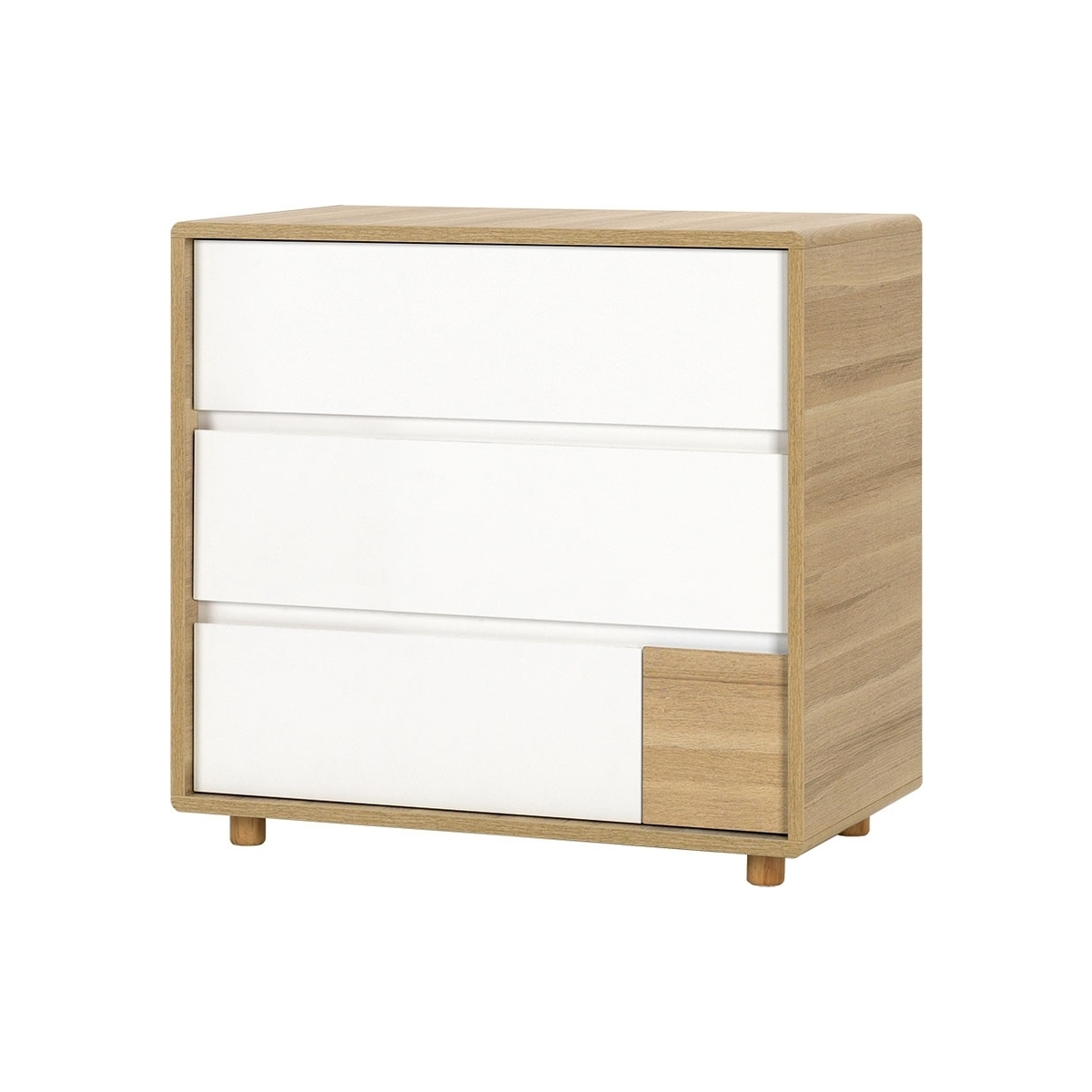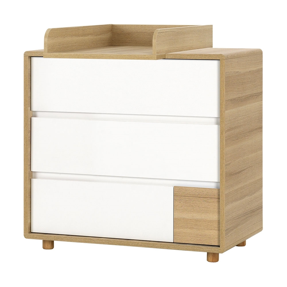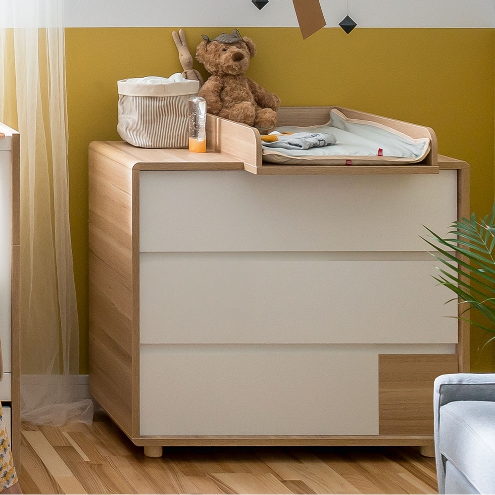 Part of the Evolve collection; keep clothes neat and tidy inside the gorgeous Vox Evolve Chest of Drawers. Including 3 deep drawers with recessed handles, rounded corners and a cinnamon oak finish, it will bring new life to your chosen space. Perfect in the kids room, they'll have no excuse when it comes to tidying away. With a removable changing top available separately, why not convert the dresser into a baby changing table with enough space to store nappies, wipes and essentials. Coordinate the storage unit with the matching wardrobe and cot bed for a contemporary nursery setup or you could always just get one for yourself? However you decide to use yours, it will be a welcome addition in your home!.