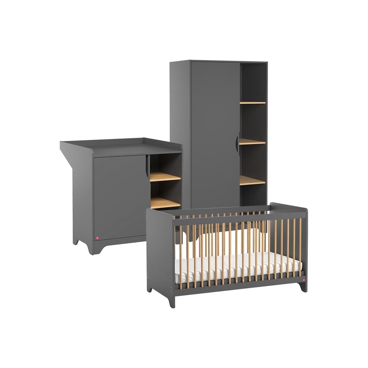 The clean, minimalist design of the Vox Leaf Cot 3 Piece Nursery Set will fit perfectly into any nursery design you have planned. This beautiful set comprises of a cot, perfect for your little one to snooze in. The cot is also height adjustable so as your little one grows it can adapt to their needs. A well crafted changing unit with bundles of storage, ideal for all of those nappy changes. And when no longer needed, the changing unit can be removed. Leaving you with a piece of furniture that will grow alongside your child. And last but by no means least, a wardrobe with plenty of space to store all of those adorable outfits. With open shelving and two hanging rails, you will never be short of storage. Available in either white or graphite to suit any colour scheme you choose.