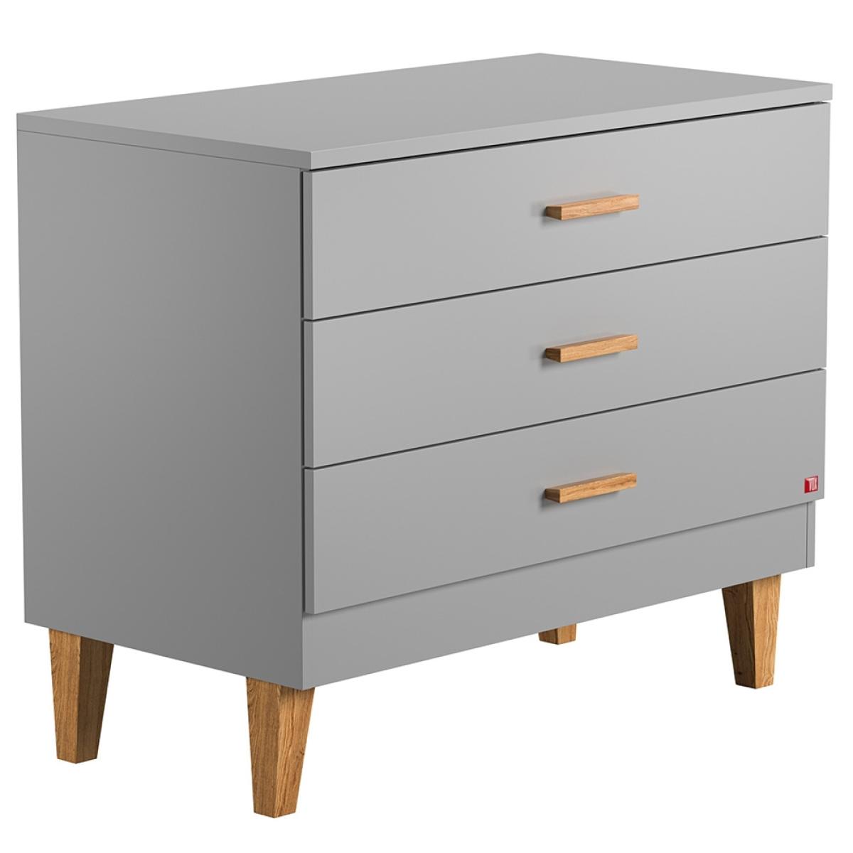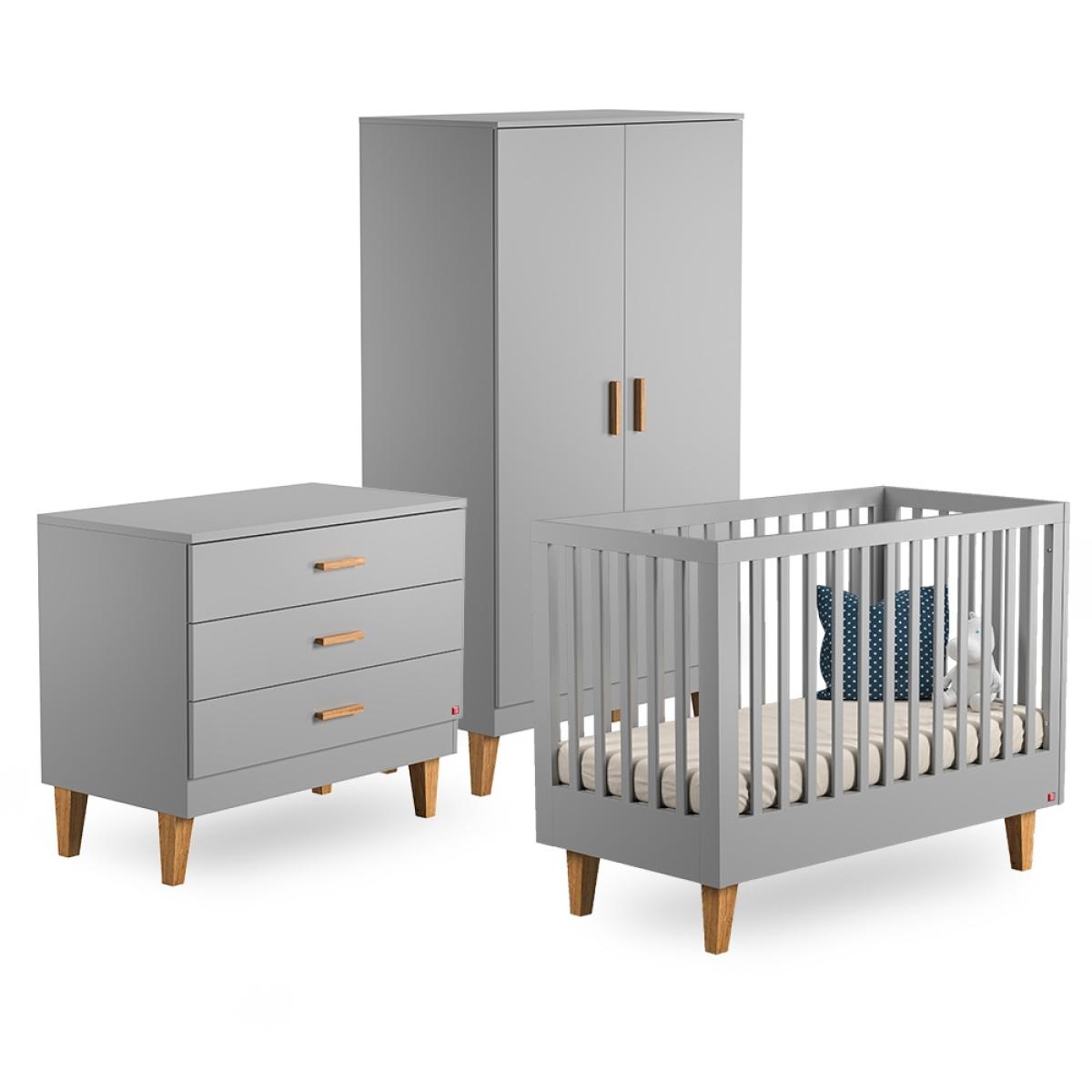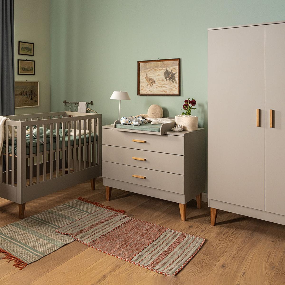 The clean, uncomplicated design of the Lounge Cot 3 Piece Nursery Set is just what you've been looking for to add some Scandistyle to your kiddies room! This gorgeous set comes complete with a cot, allowing your baby (and you!) to sleep peacefully through the night. A beautifully crafted wardrobe that offers up plenty of space for those onesies, blankets and toys, we know there are hundreds! Finally a simple yet sophisticated chest of drawers, with the option to add a changing table top it will be ideal for those late night nappy changes. The three drawers offer up all the space you require for those essentials whilst changing your little one's nappy and being removable when it is no longer needed you are left with a lovely chest of drawers for your youngster to grow up with! Whether it's a girl or a boy, the light grey paired with the solid oak, this beautiful set will fit right in!.