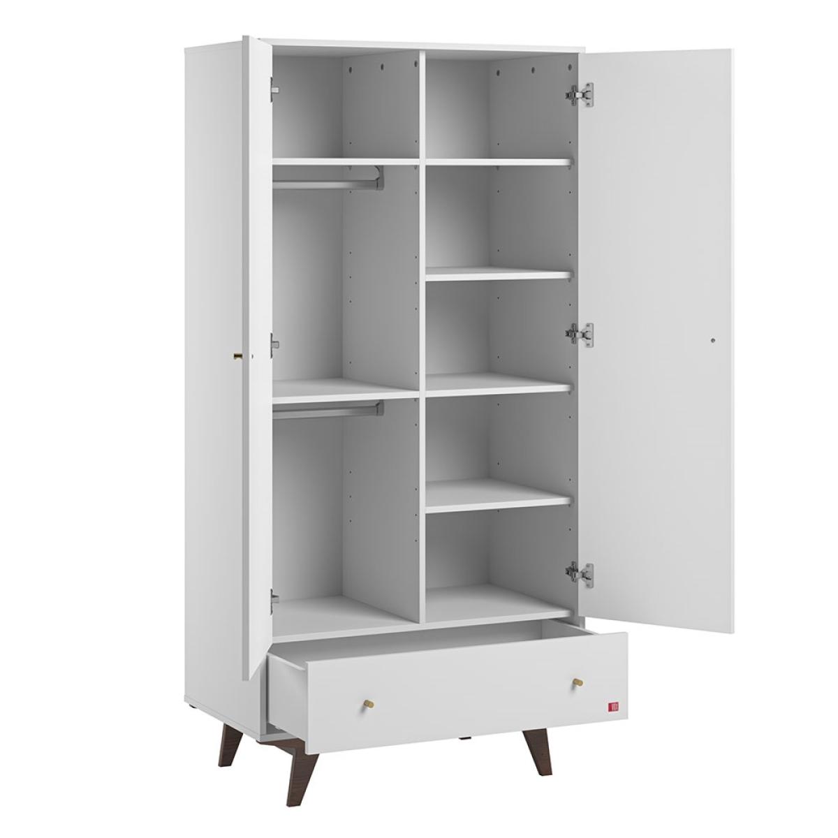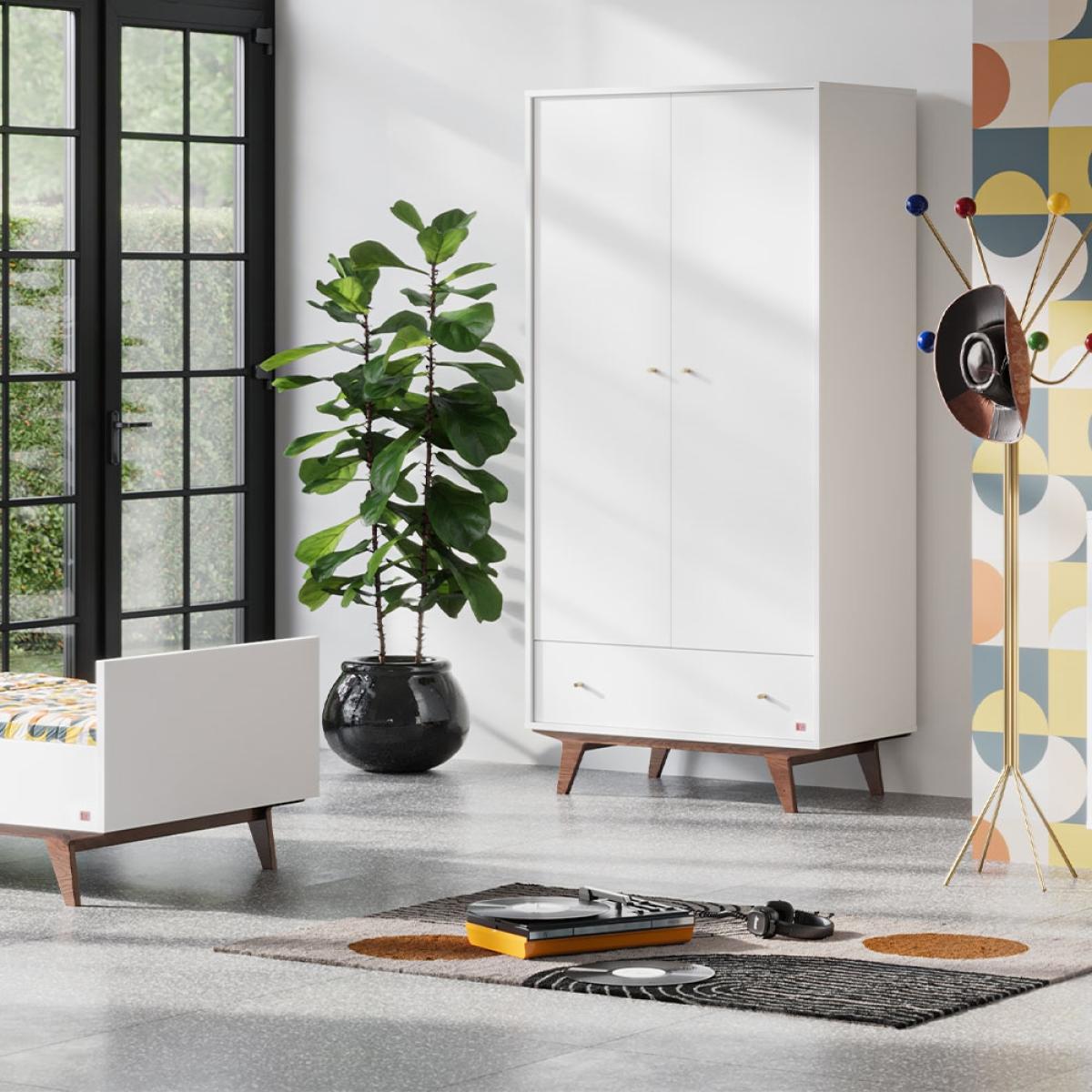The Mid 2 Door Wardrobe with Storage is part of the new 'Mid' nursery furniture range from Vox. Inspired by the cool furniture revolution of the mid-20. Th. Century - this retro range oozes elegance from yesteryear. The two-door wardrobe has one side with shelves for folded clothes and paraphernalia,. And the other side very thoughtfully has two hanging rails – let's face it, not many babies require full-height hanging space for their outfits!. A useful drawer at the bottom provides extra storage. All in all, this nursery wardrobe is super useful and so stylish that it doesn’t have to be consigned to history once the nursery is no longer needed, it will look great in any bedroom.